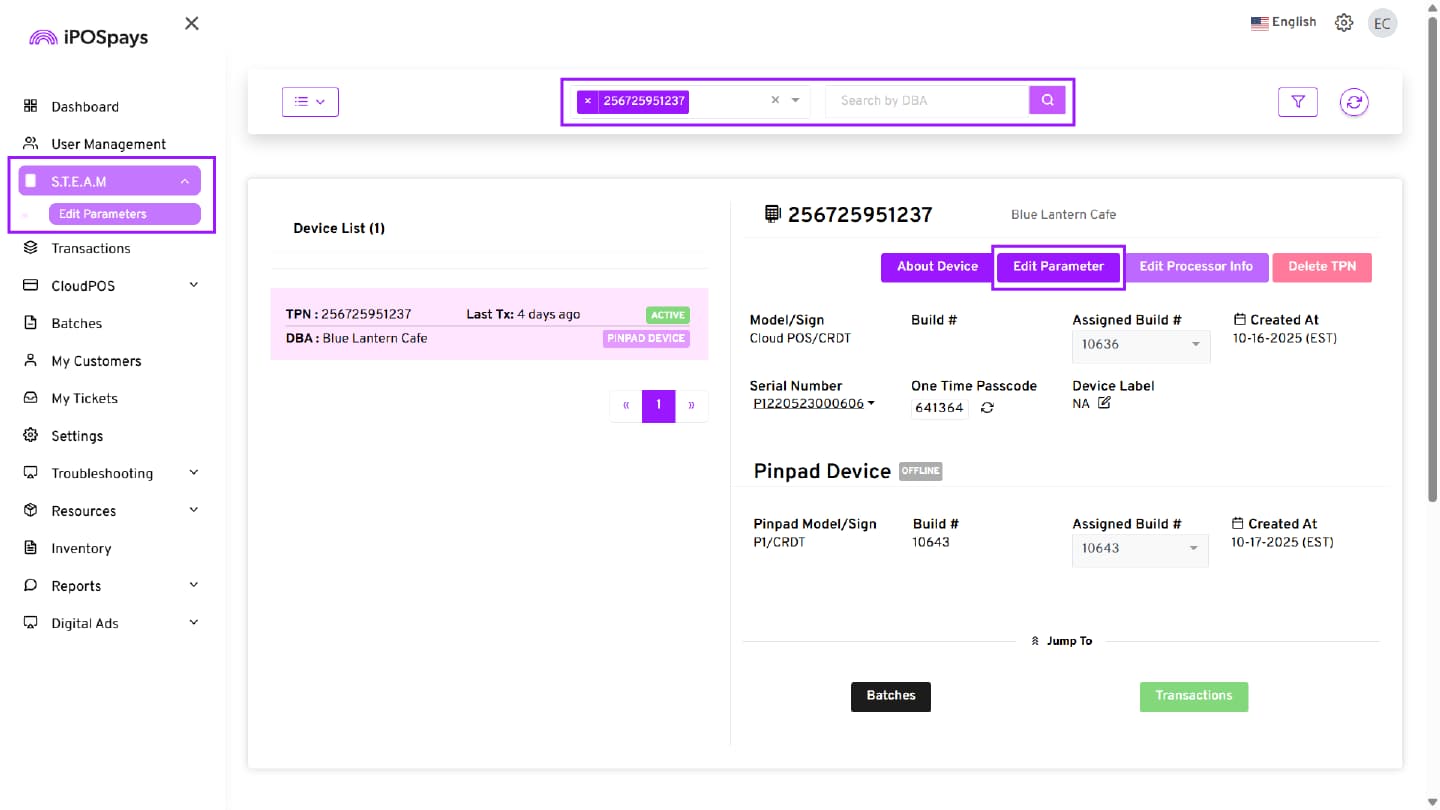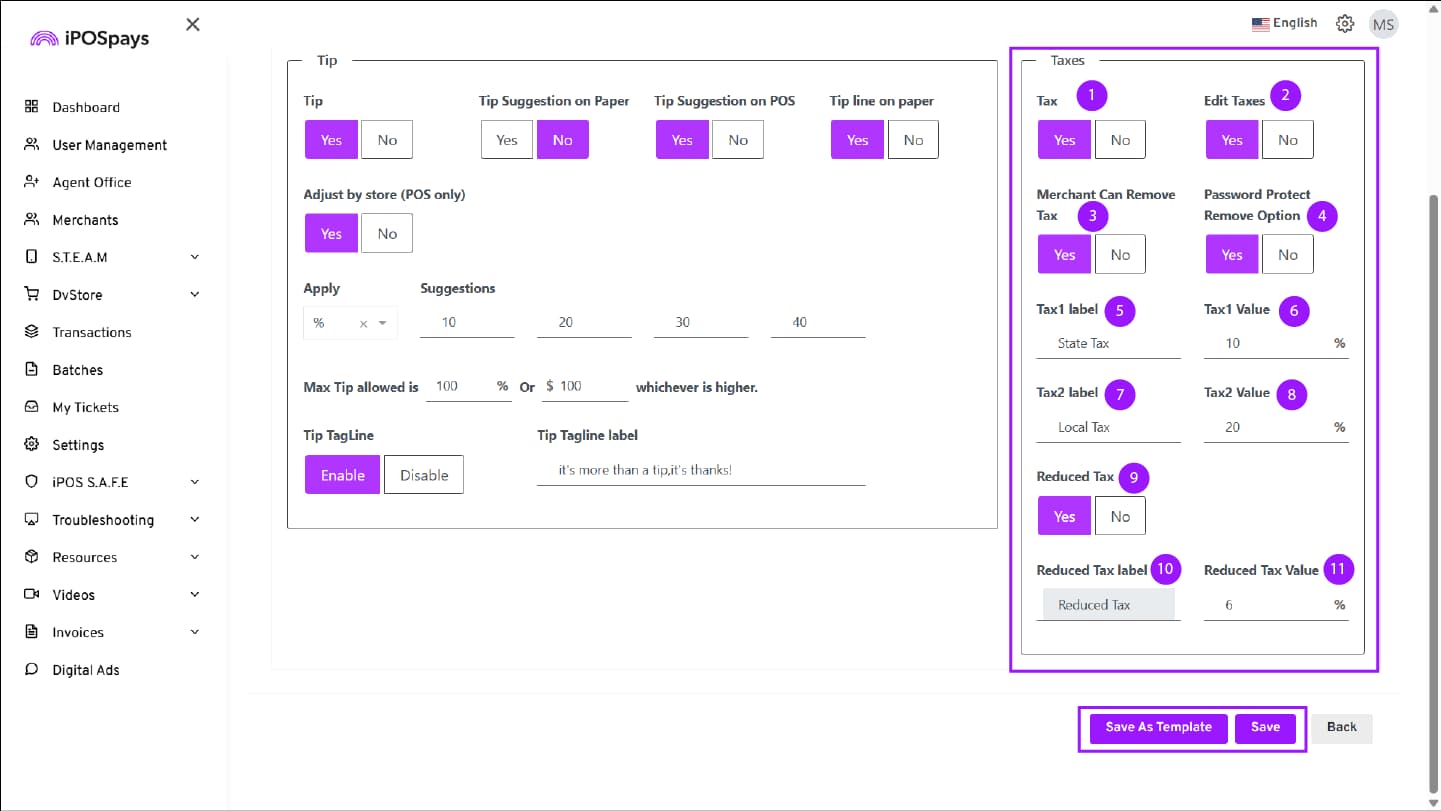 If the merchant uses POS, CloudPOS, or iPOSgo!, taxes can be configured from both the ISO login and the Merchant login in the Edit Parameter module of the iPOSpays Portal.