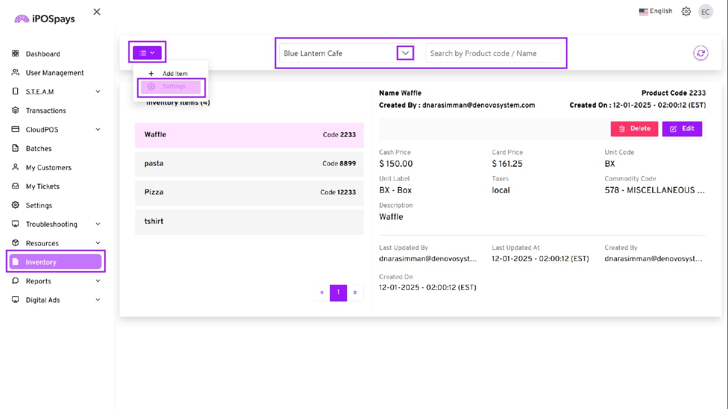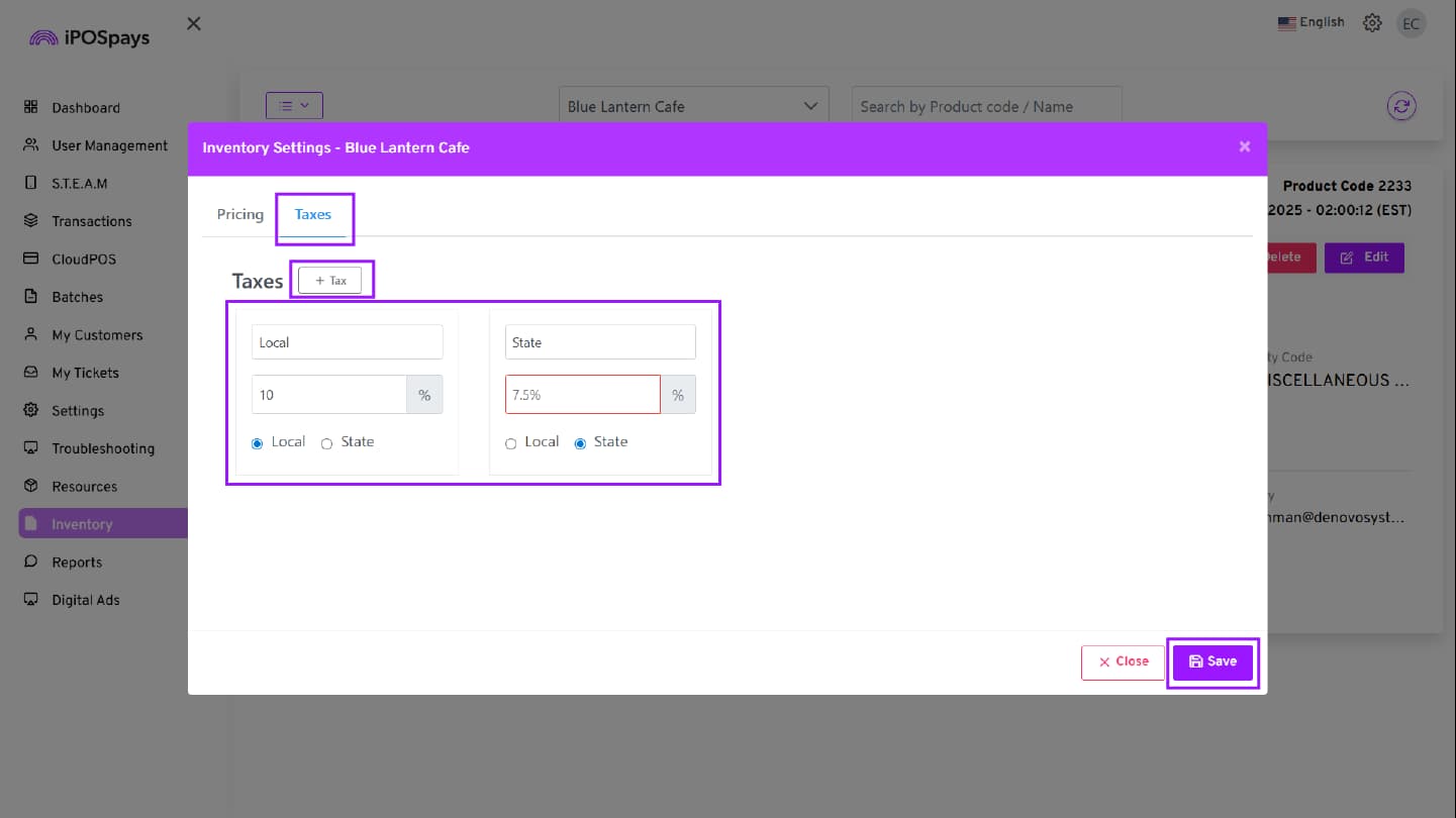 Taxes configured here apply only to Register Lite and CloudPOS Itemized Billing, and tax selection is performed at the item level when products are added to inventory. Any tax configured from the payment terminal will automatically sync back to the iPOSpays Portal.