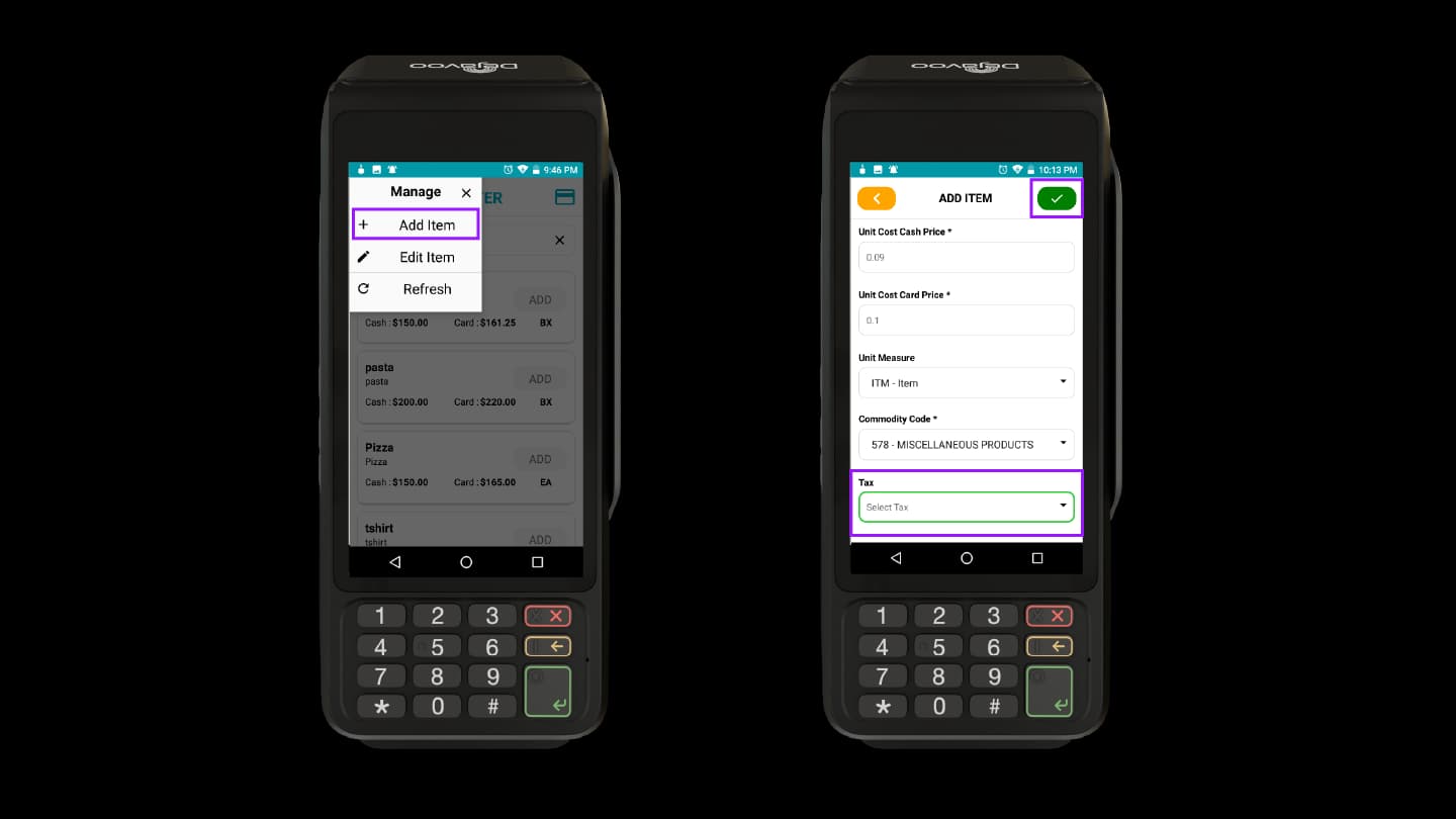 You can add a product directly from the terminal. Click Add Item to open the Add Item screen, then enter all the product details, including the applicable tax.