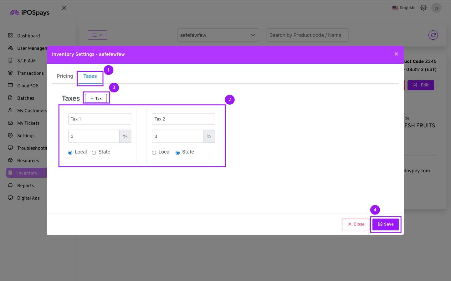 Select the Taxes tab to configure the applicable tax percentages for inventory items.