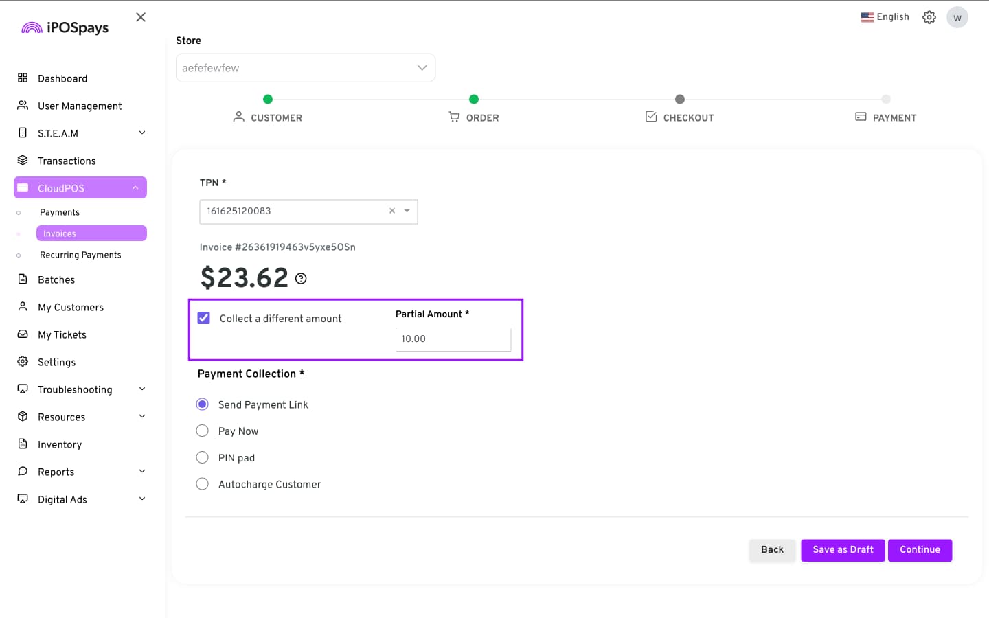 “Collect a different amount” allows merchants to collect a portion of the invoice amount and collect the remaining balance later.