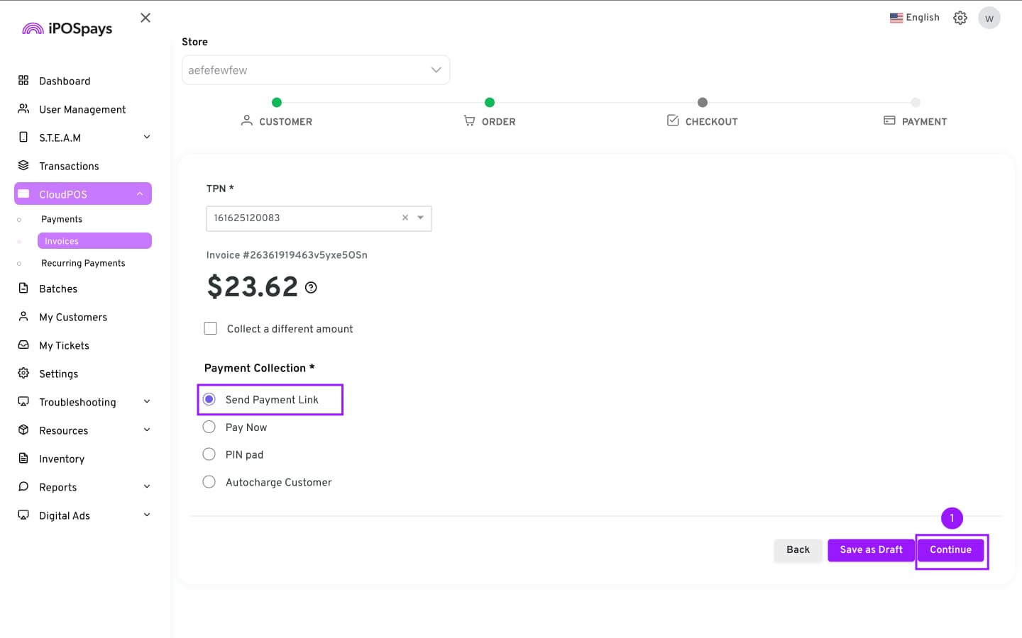 - Choose Send Payment Link and click Continue.