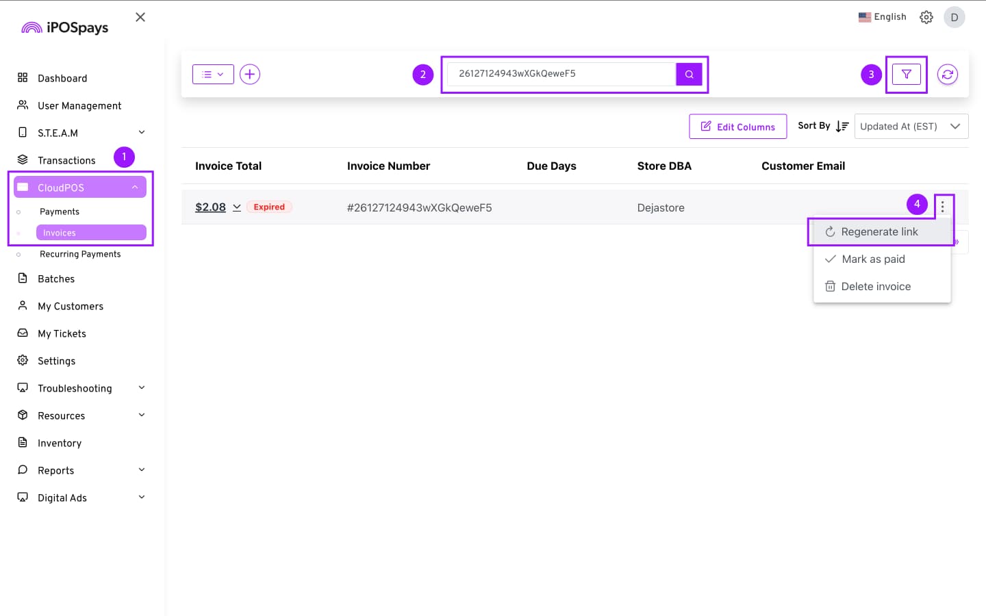 After finding the right invoice, click on the 3 dots on the right side of the screen → Regenerate Link