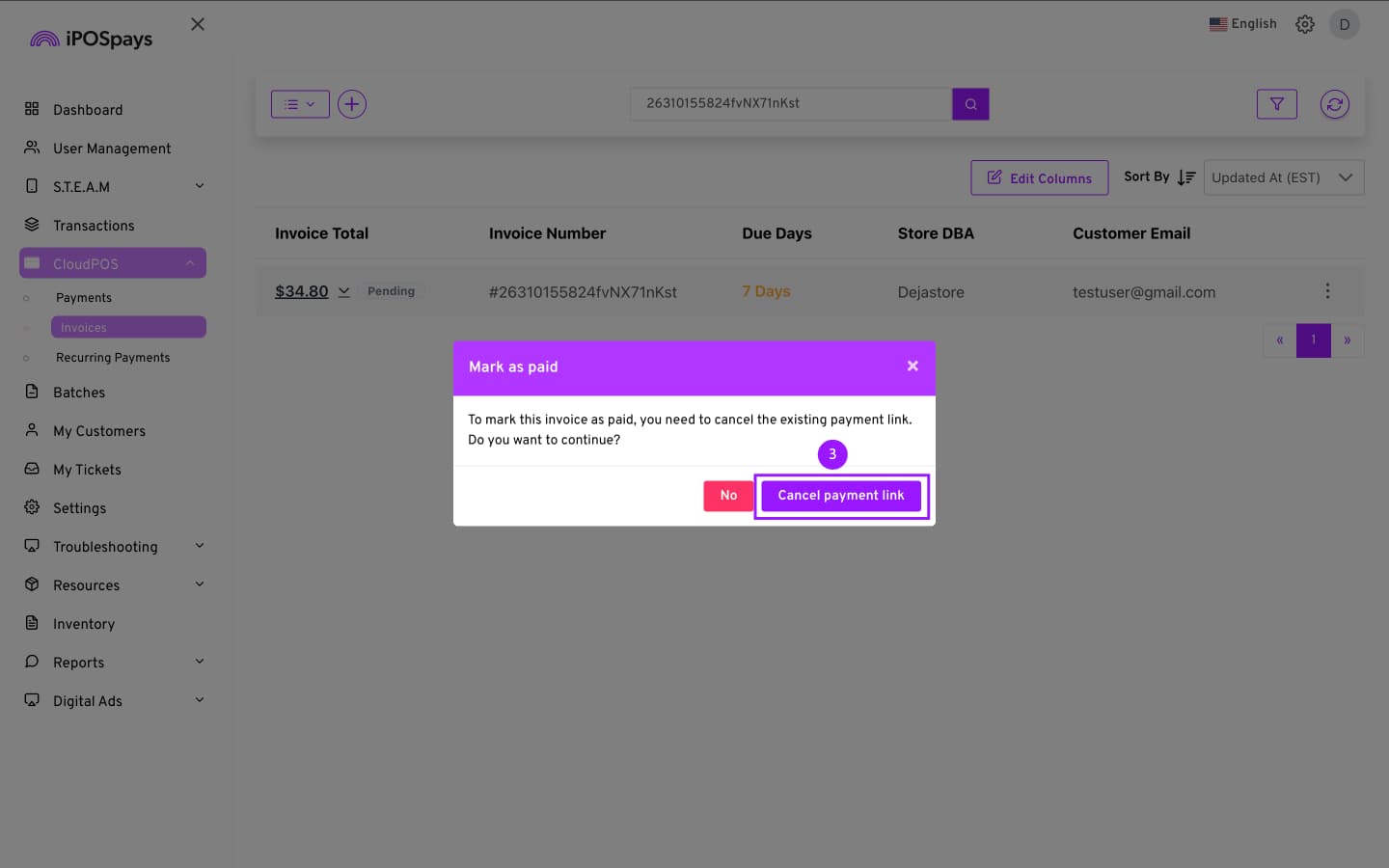 - A prompt will appear asking you to cancel the payment link sent to the customer, which will make the payment link expire. To mark the invoice as paid, the current invoice link must be canceled. Click Cancel Payment Link.
