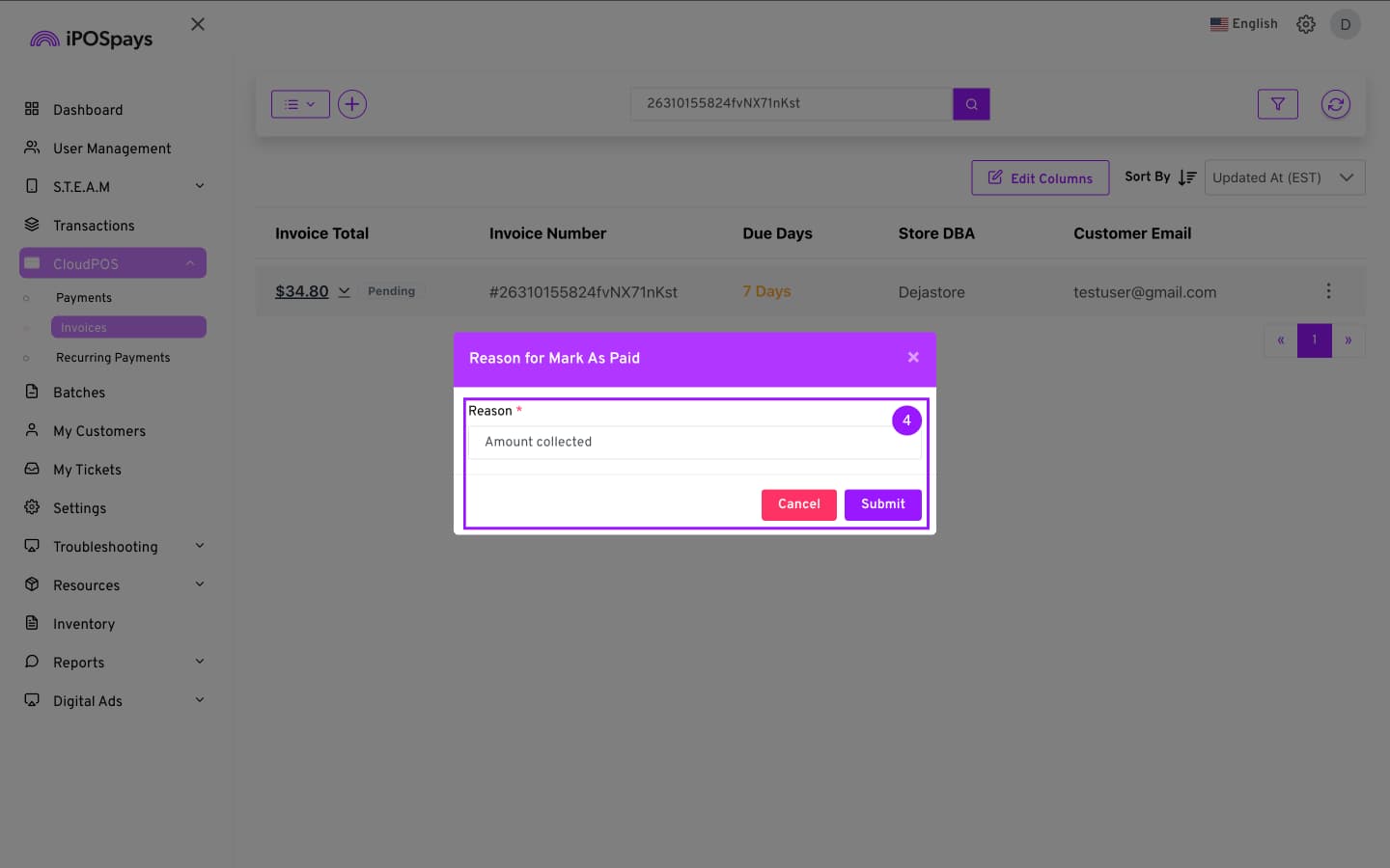 - Enter a reason as to why the invoice is being marked as paid and click Submit.