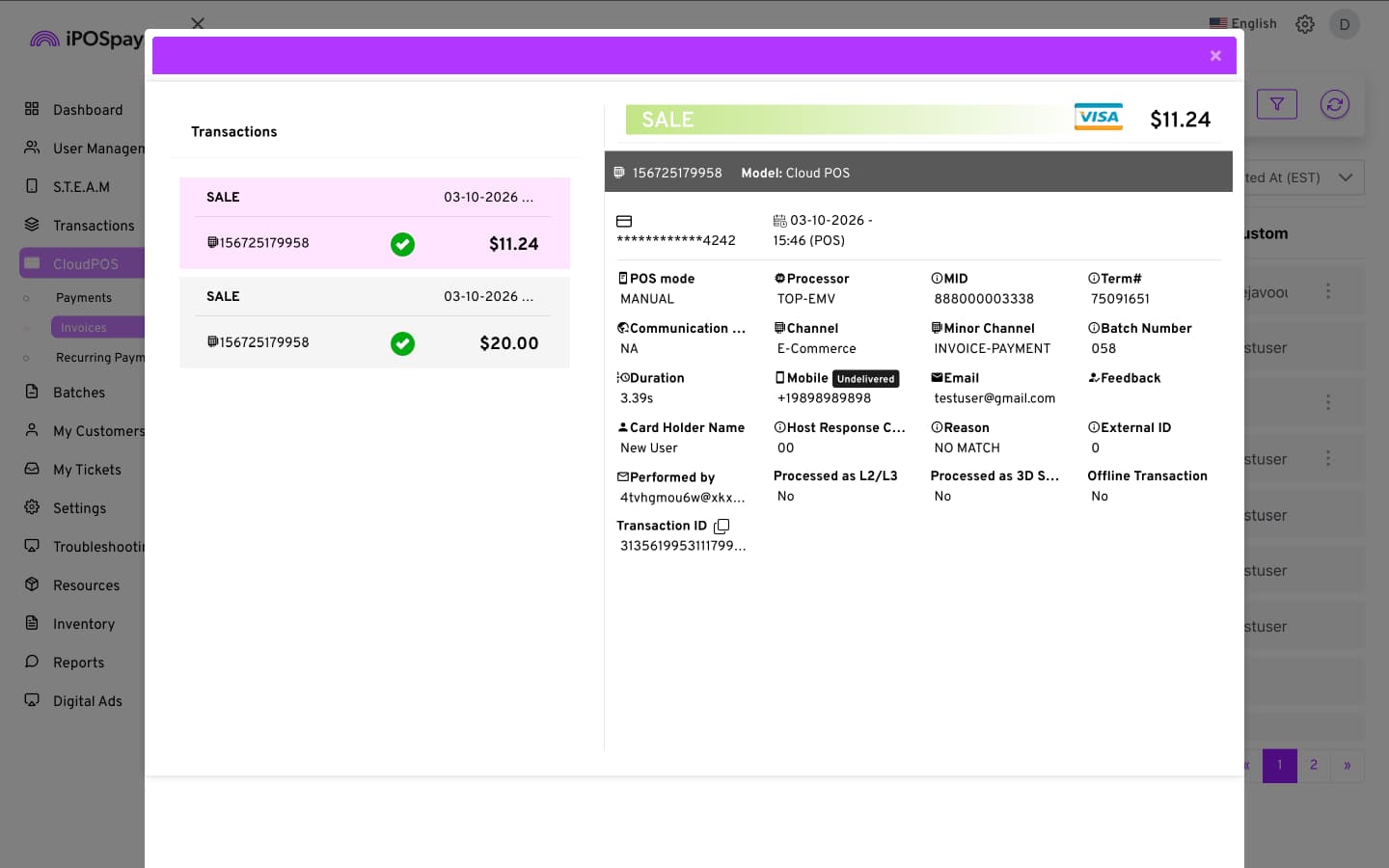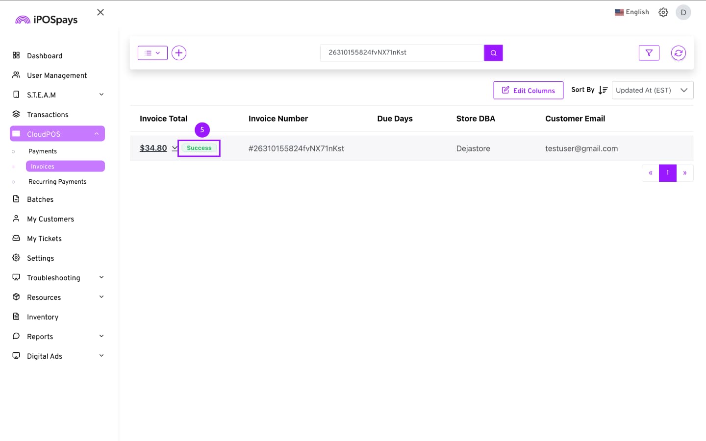 - The invoice has been processed as paid, and the transaction status will change from Pending to Success