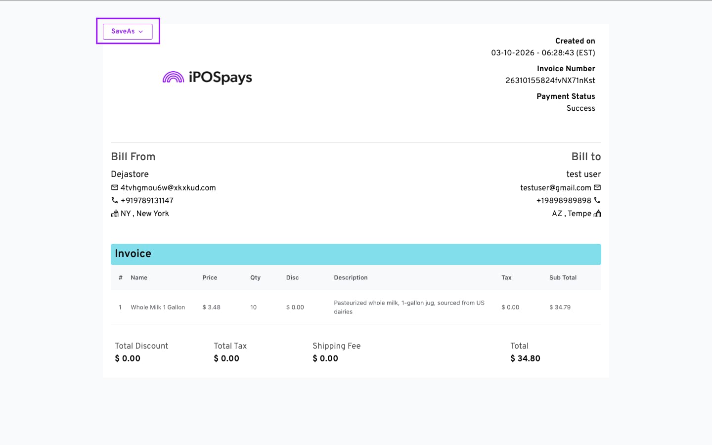 You can save the invoice as a PDF or PNG by clicking the SaveAs button in the top-left corner of the screen.