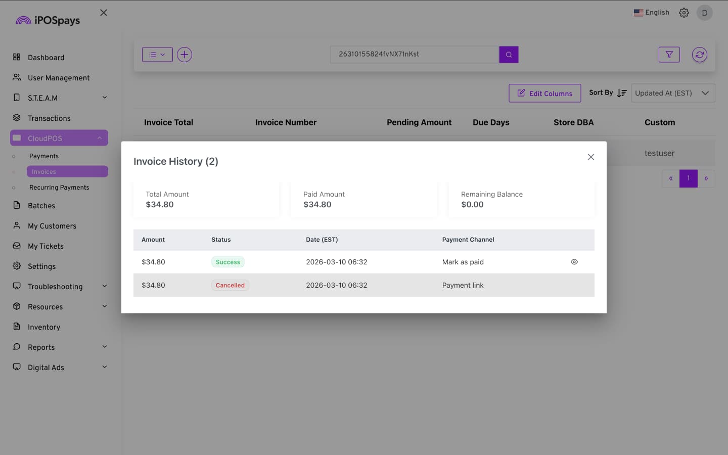 The Invoices module allows merchants to view the invoice details and payment history after an invoice has been created.
