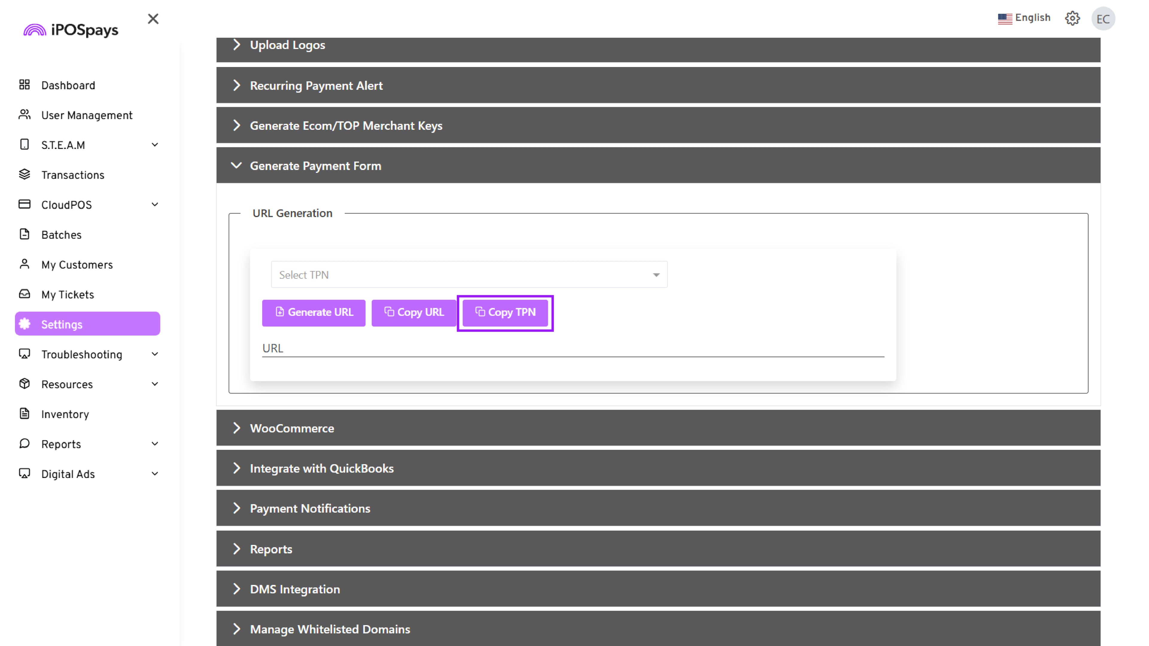 - (Optional) Click Copy TPN to copy the terminal number for record-keeping or integration reference.