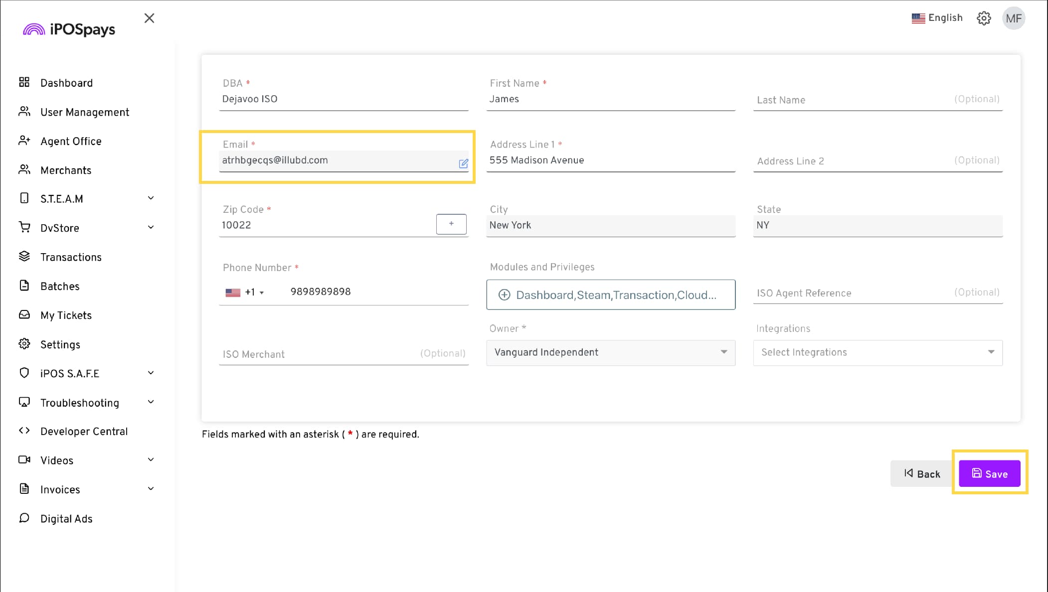 Enter the merchant’s email address and phone number.