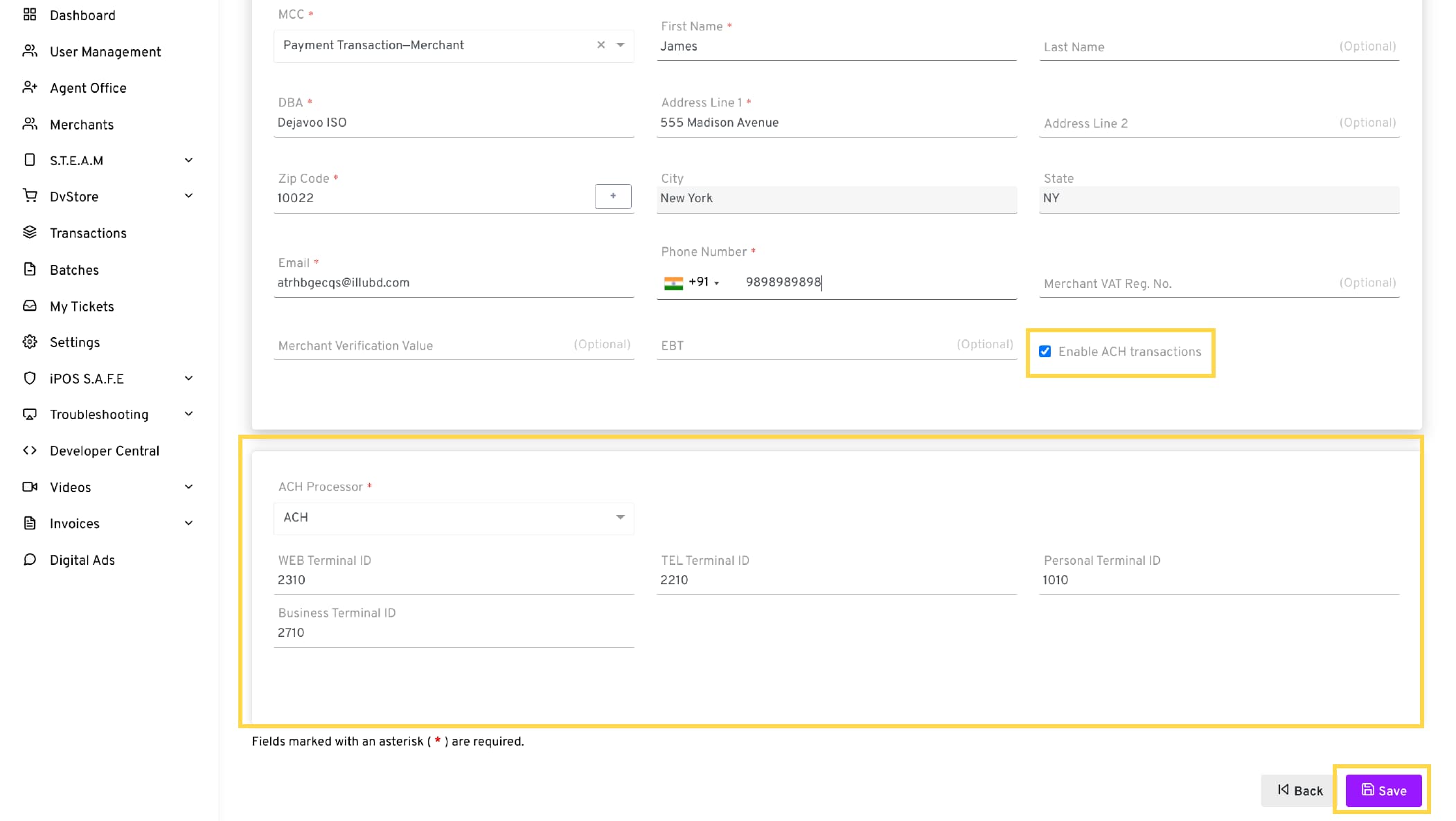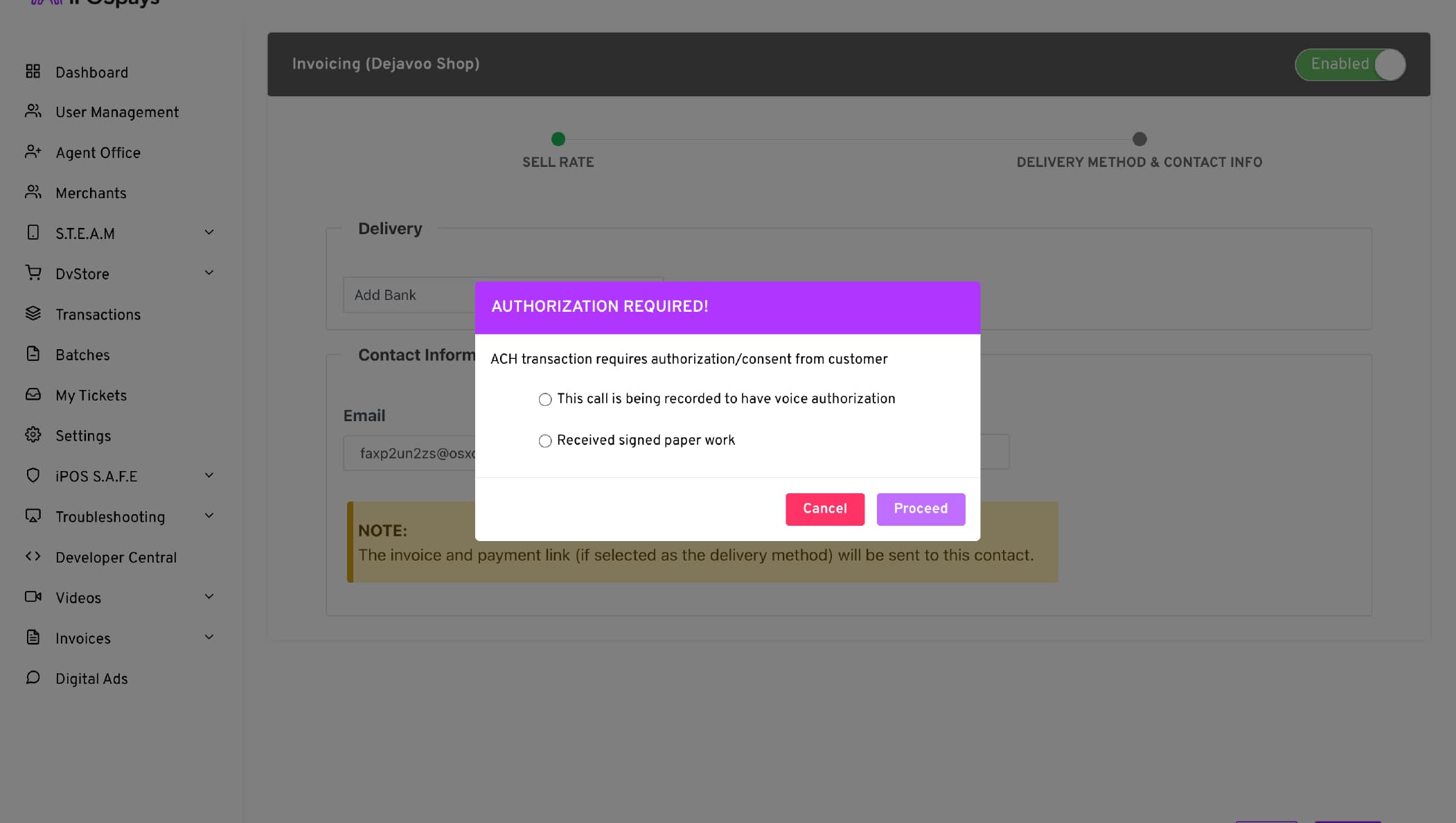 To directly bill merchants using their bank account details, enable and configure ACH as a payment method for invoice delivery. Registration with Paya ACH is required to complete the necessary fields. Please contact your Dejavoo Sales Executive for guidance on this process.