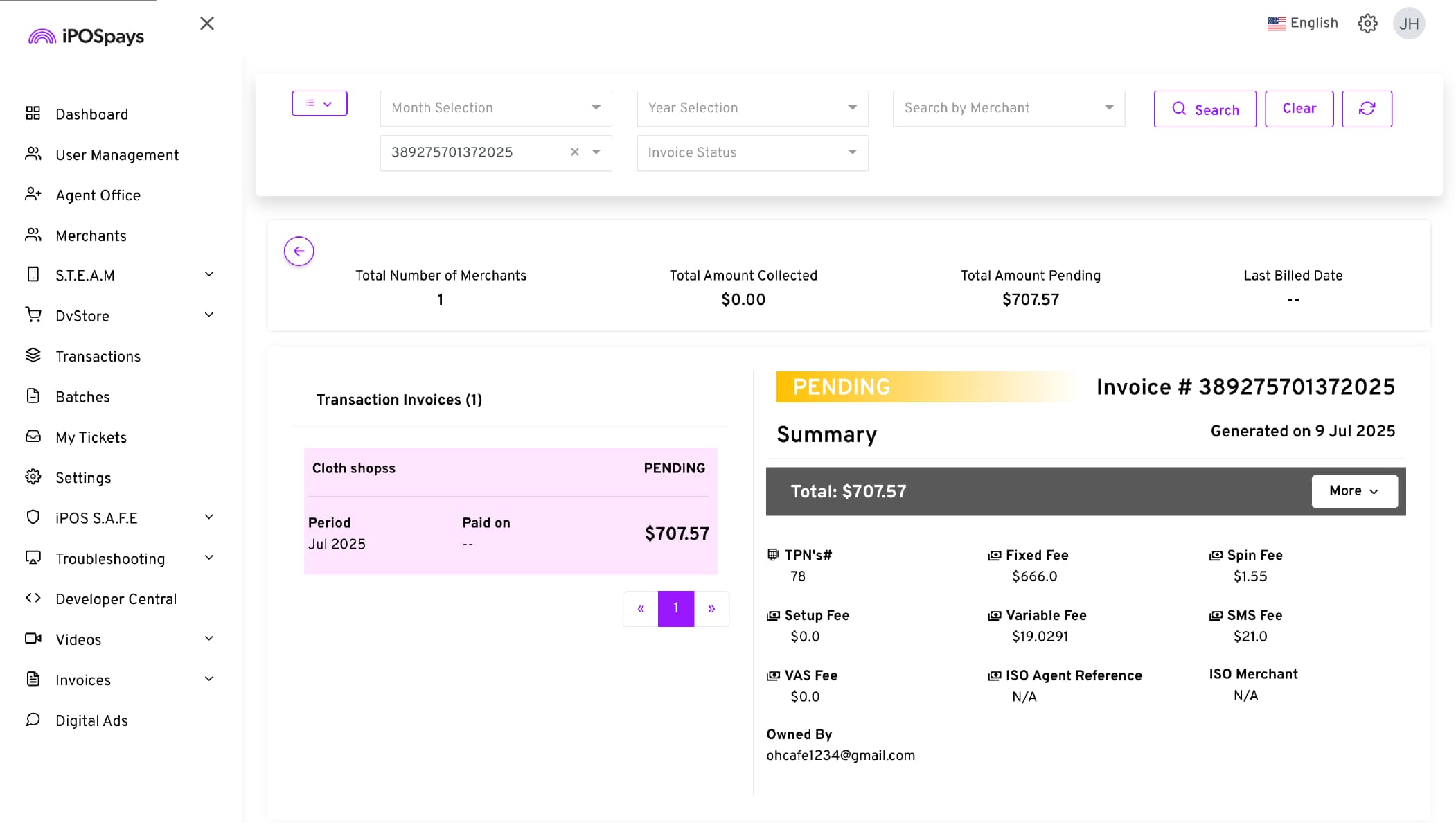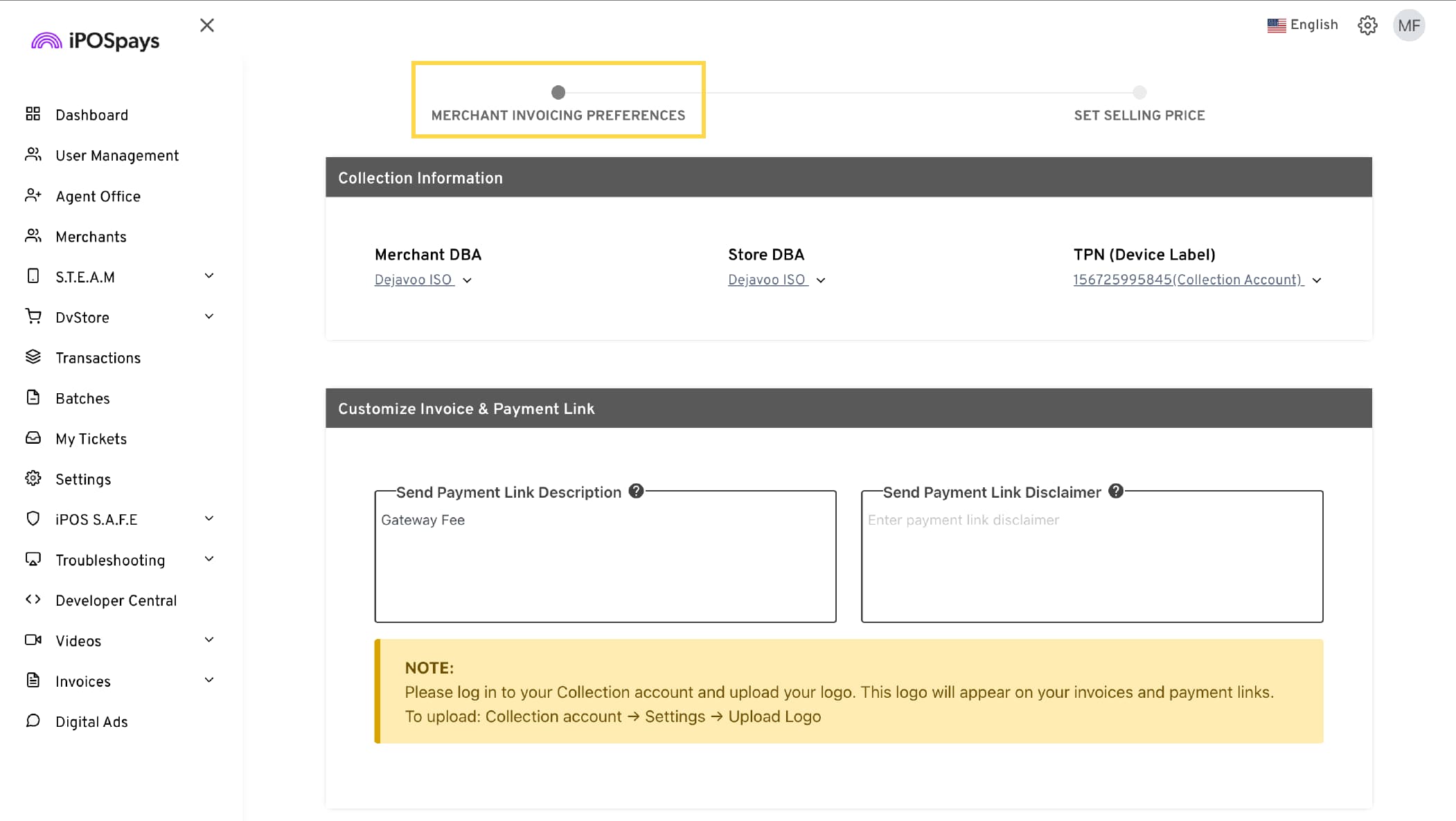 Before you begin: If you do not see Merchant Invoicing under Invoices in your ISO account sidebar, it means this feature has not been activated for your account. Contact your Dejavoo representative to get it enabled.