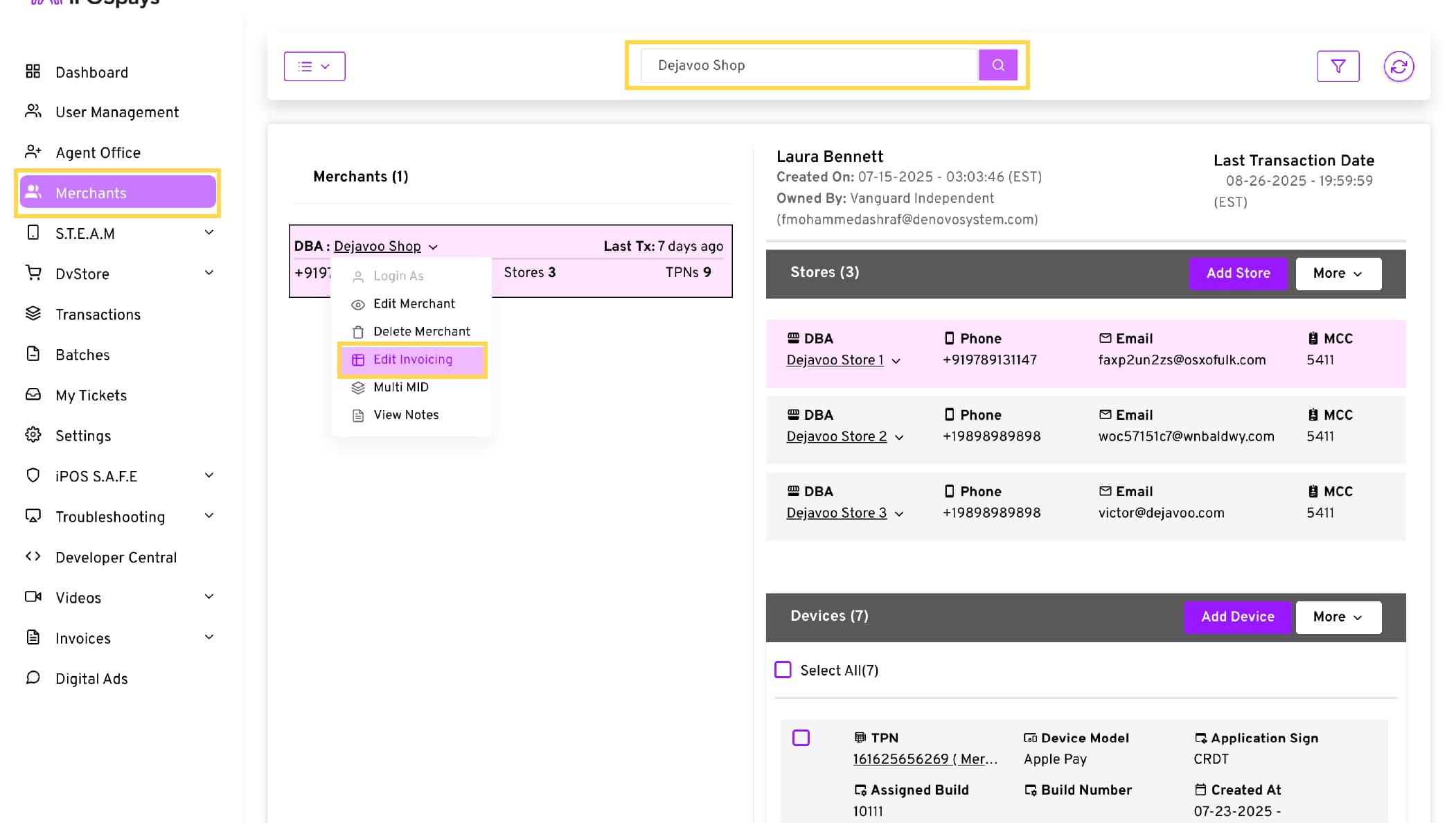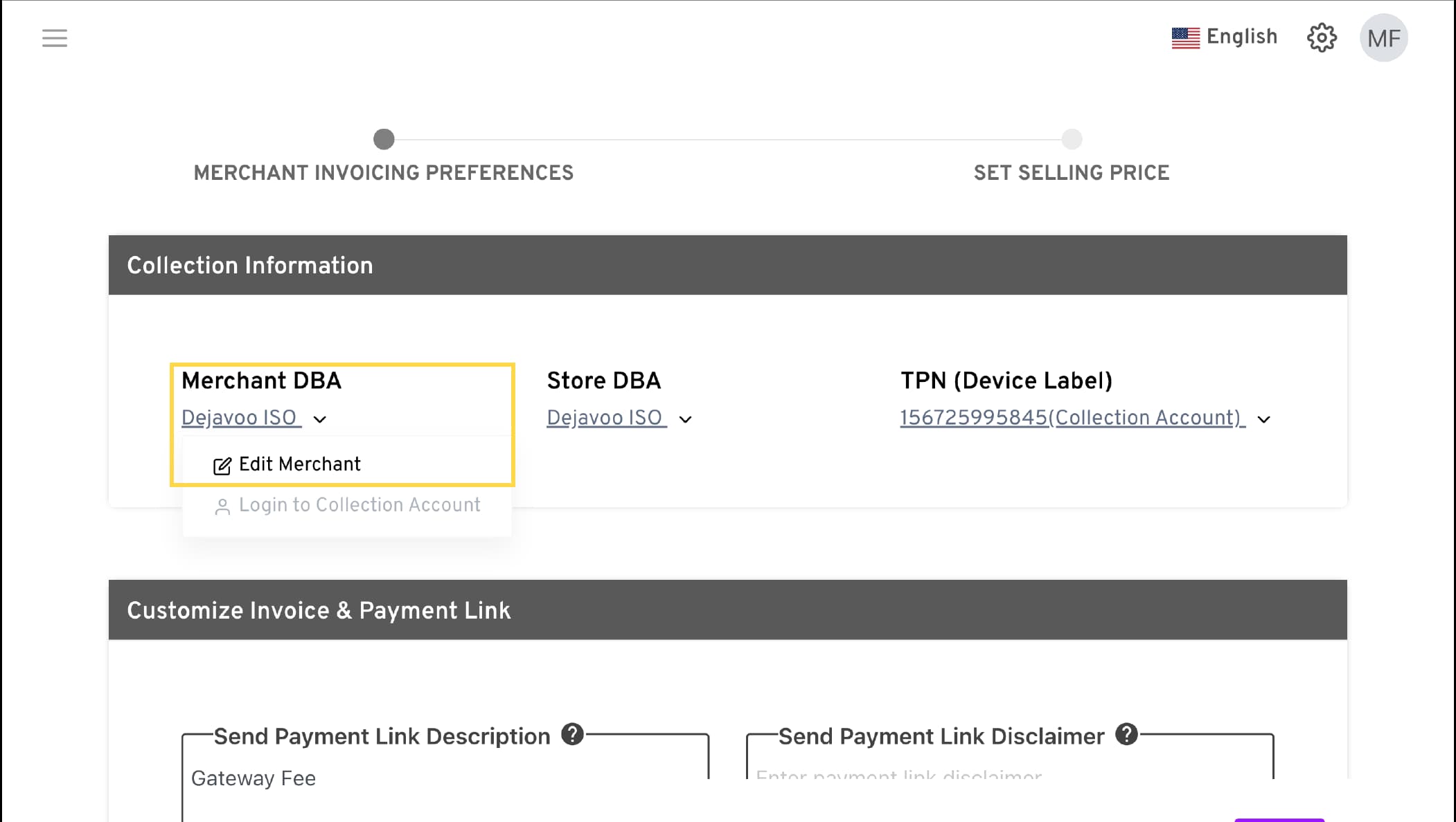 Click on their DBA → Edit Invoicing. You’ll land in the edit invoicing tab for this specific merchant.