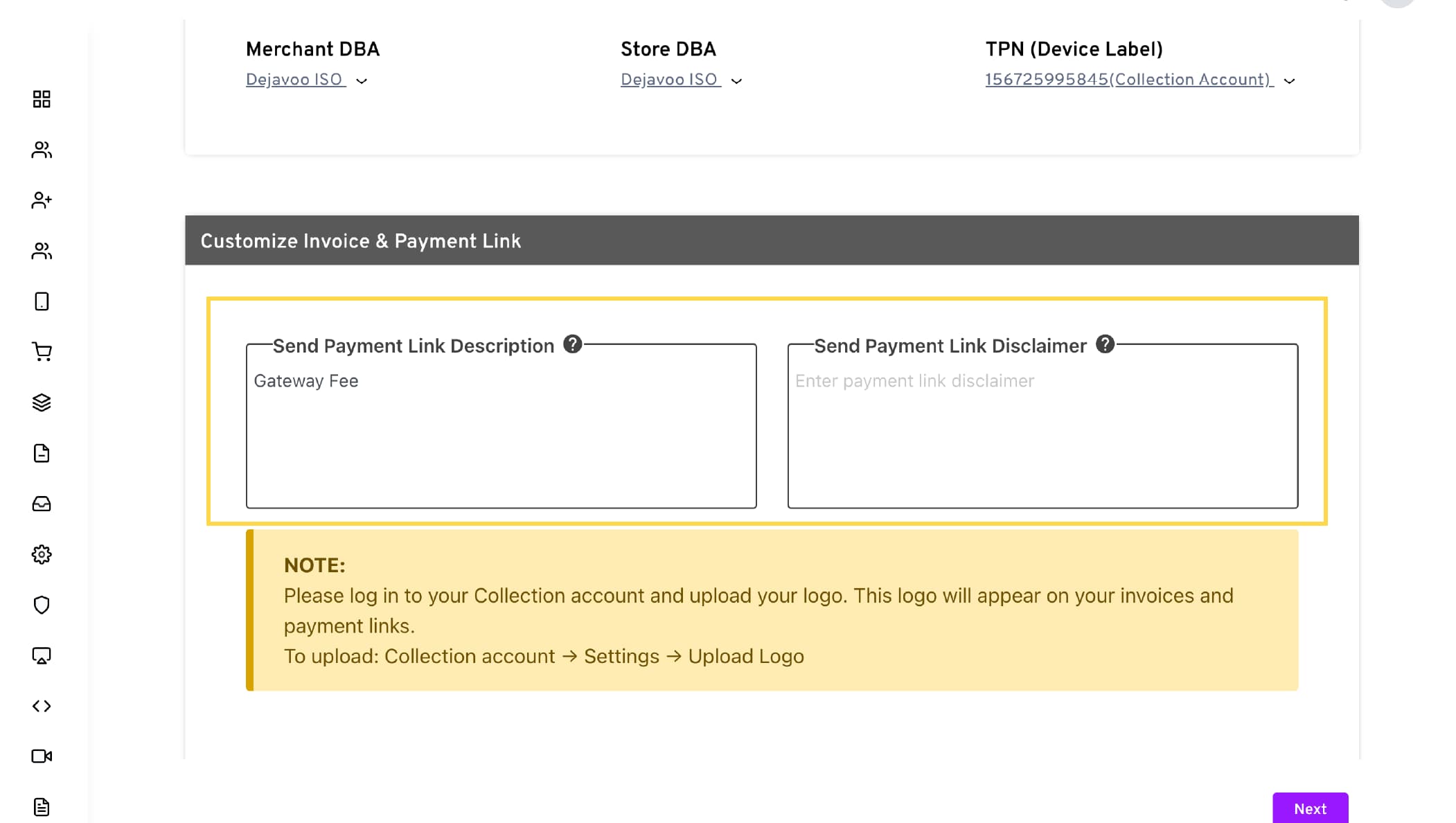 Send Payment Link Disclaimer → Add a disclaimer that will appear on the payment link page.