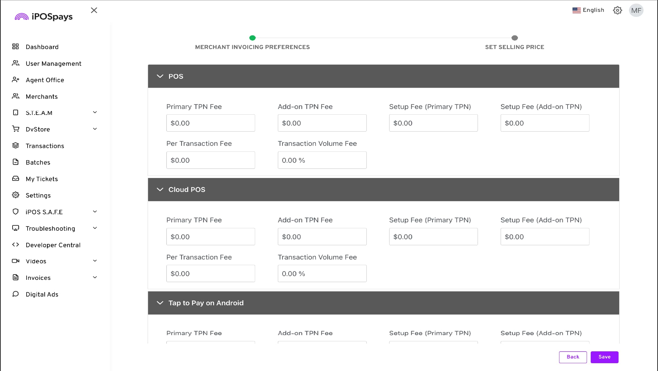 Define the selling price for each service. The prices set for your ISO account and iPOSpays services are automatically carried over and prefilled here. You can adjust these prices and charge your customers as you prefer.