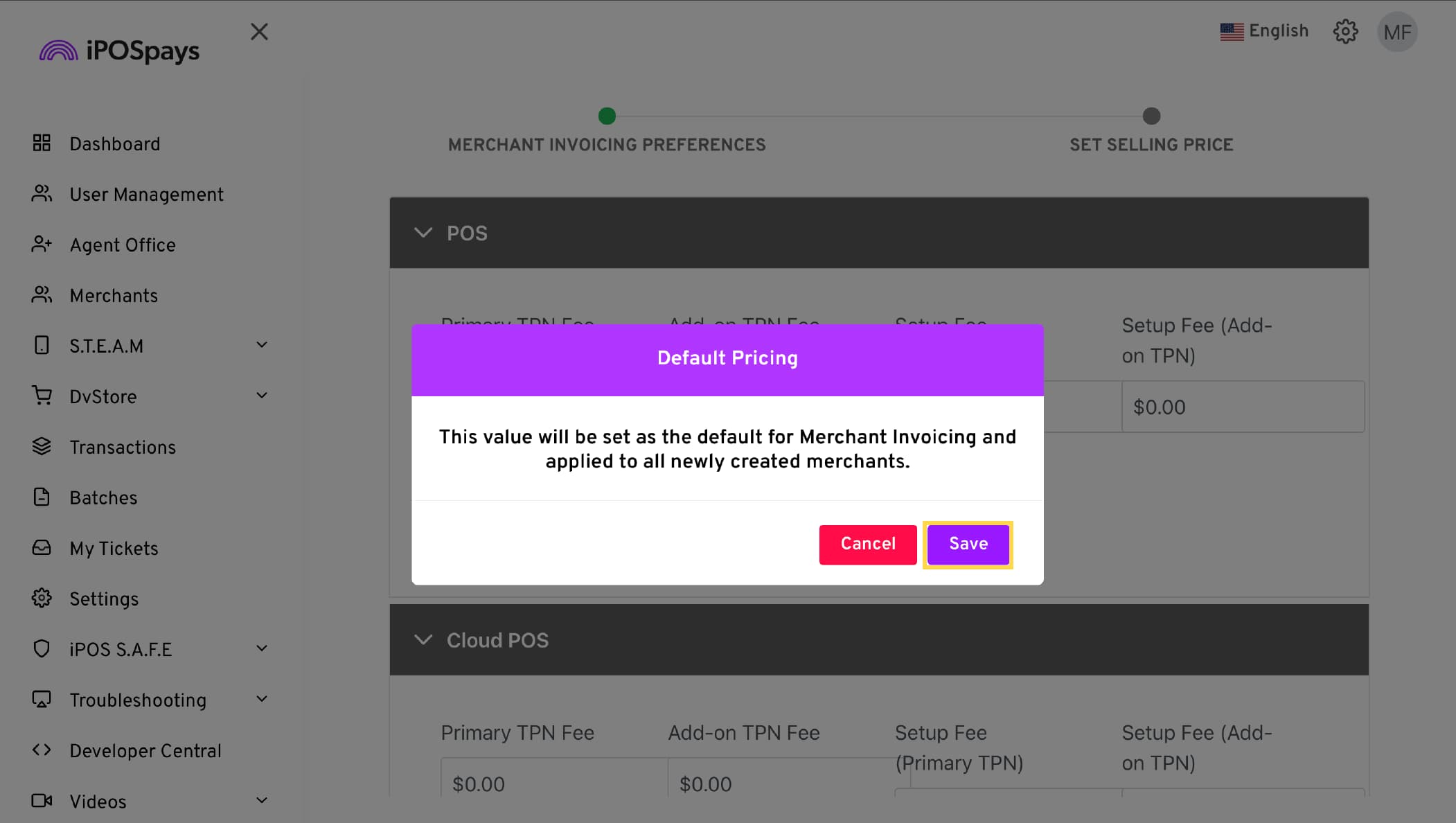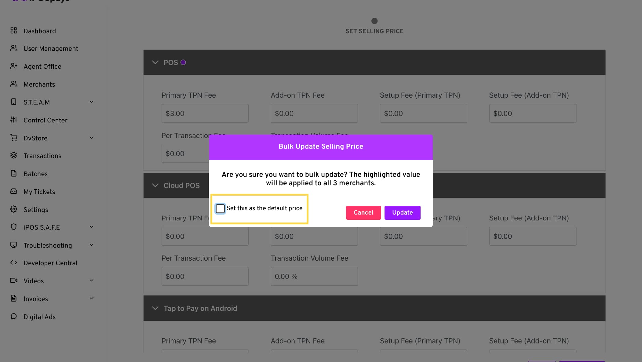 b. Example: If you update the price of Primary TPNs, only that price changes for all merchants while all other prices remain unchanged.