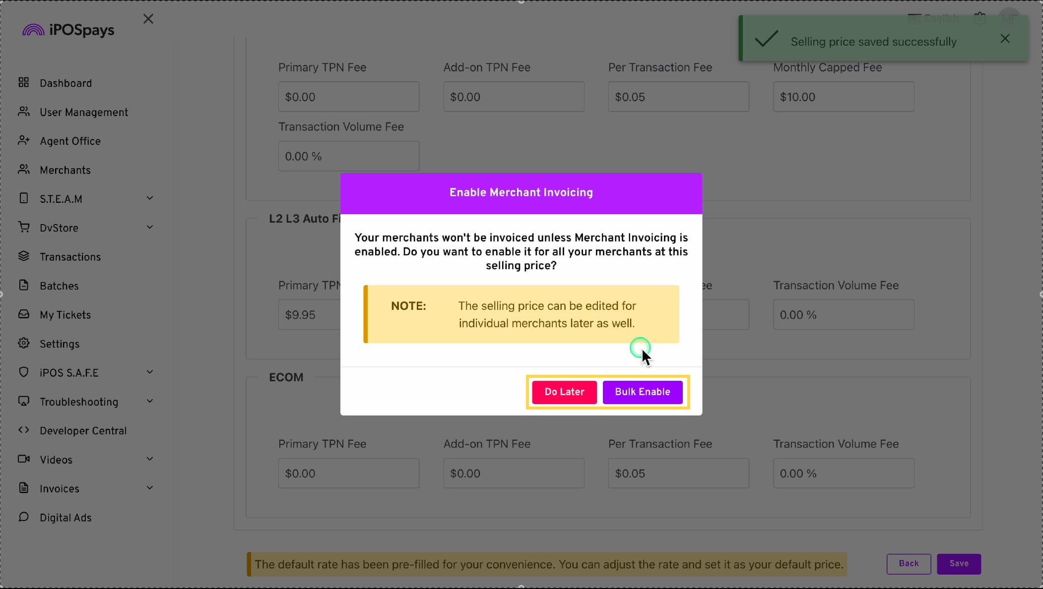 - Click, Bulk Update to enable Merchant Invoicing for the newly onboarded merchants