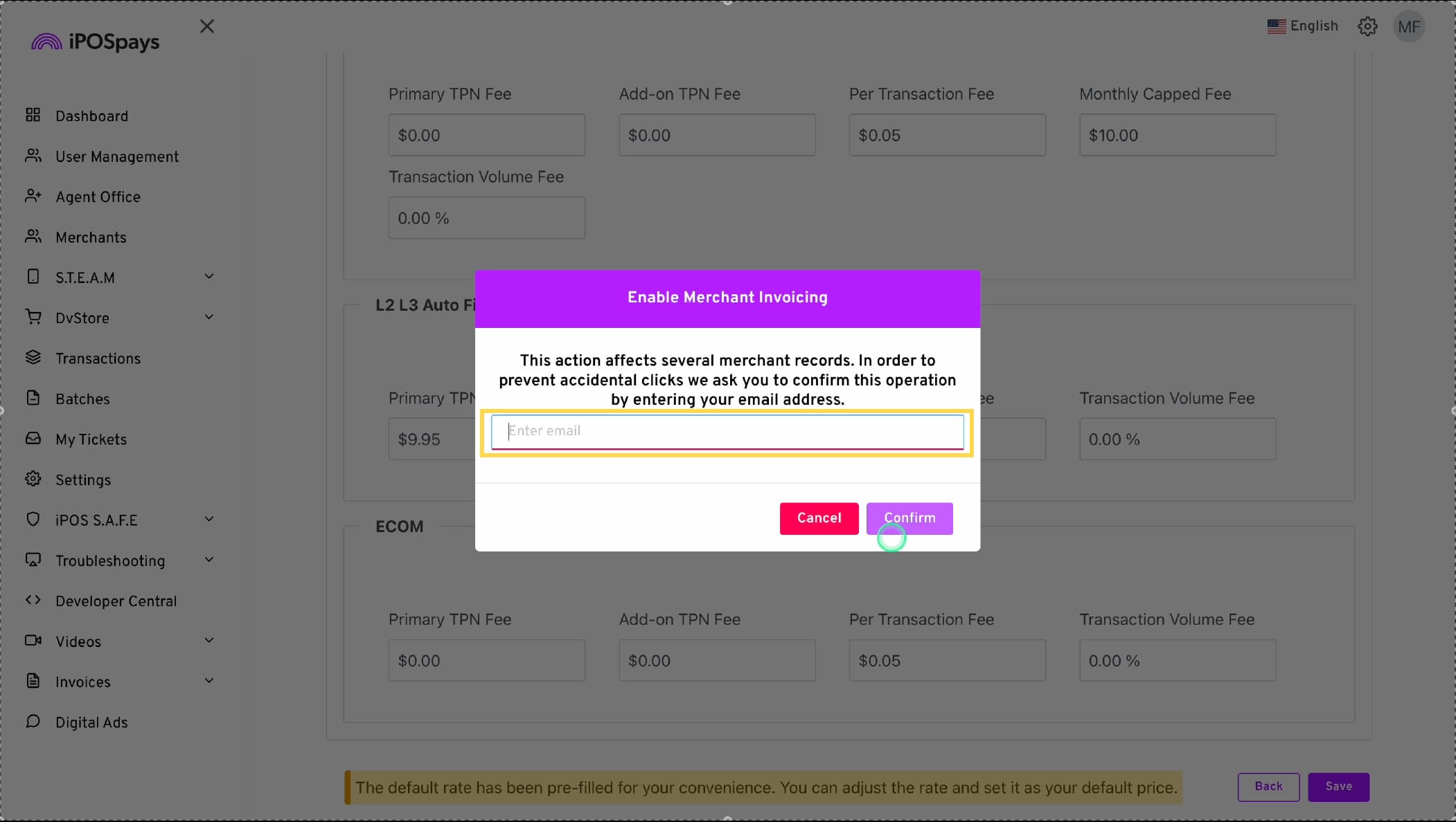 Prompt 2: Reminder that merchants won’t be invoiced unless Merchant Invoicing is enabled.