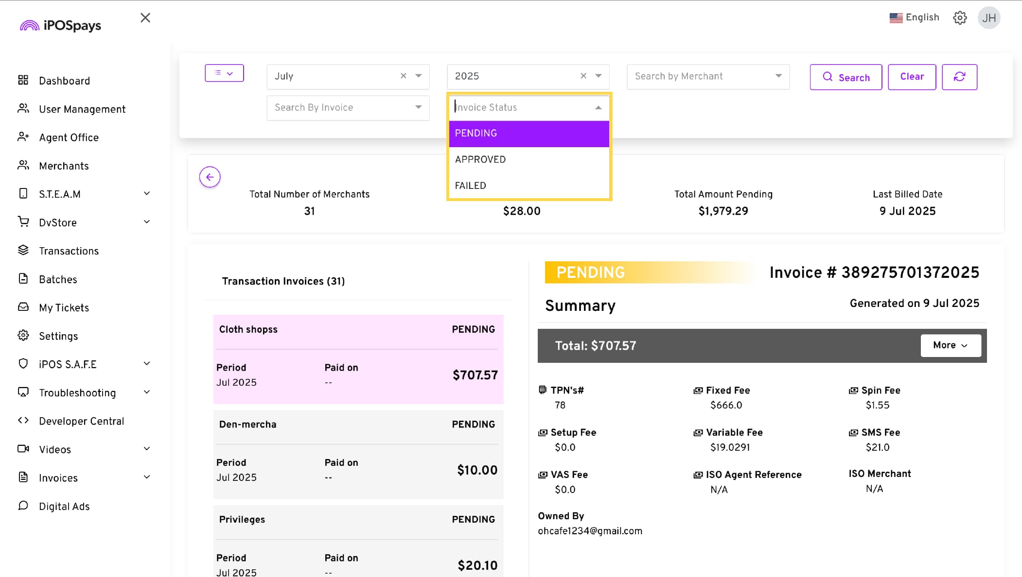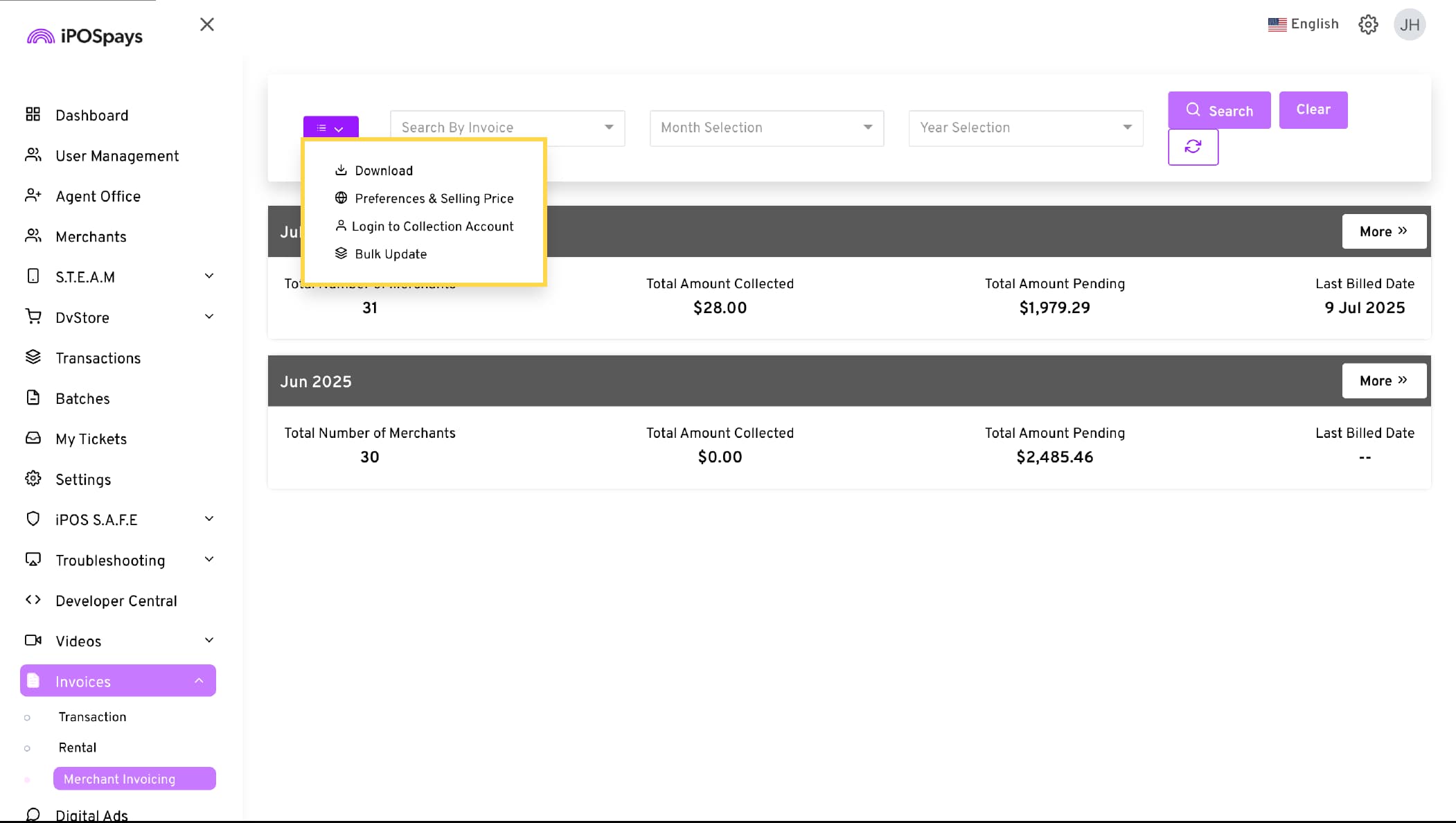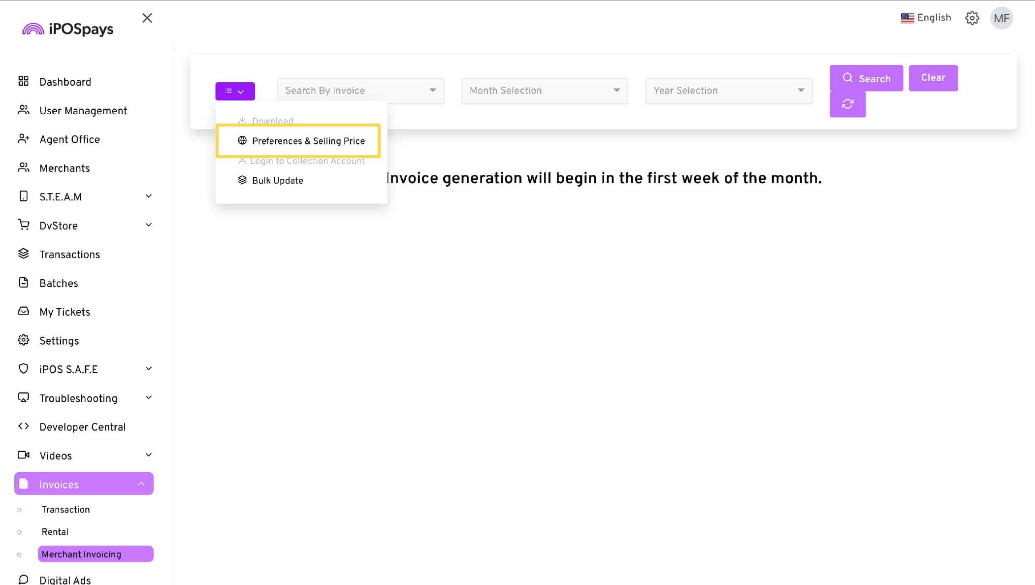 Go to Invoices → Merchant Invoicing