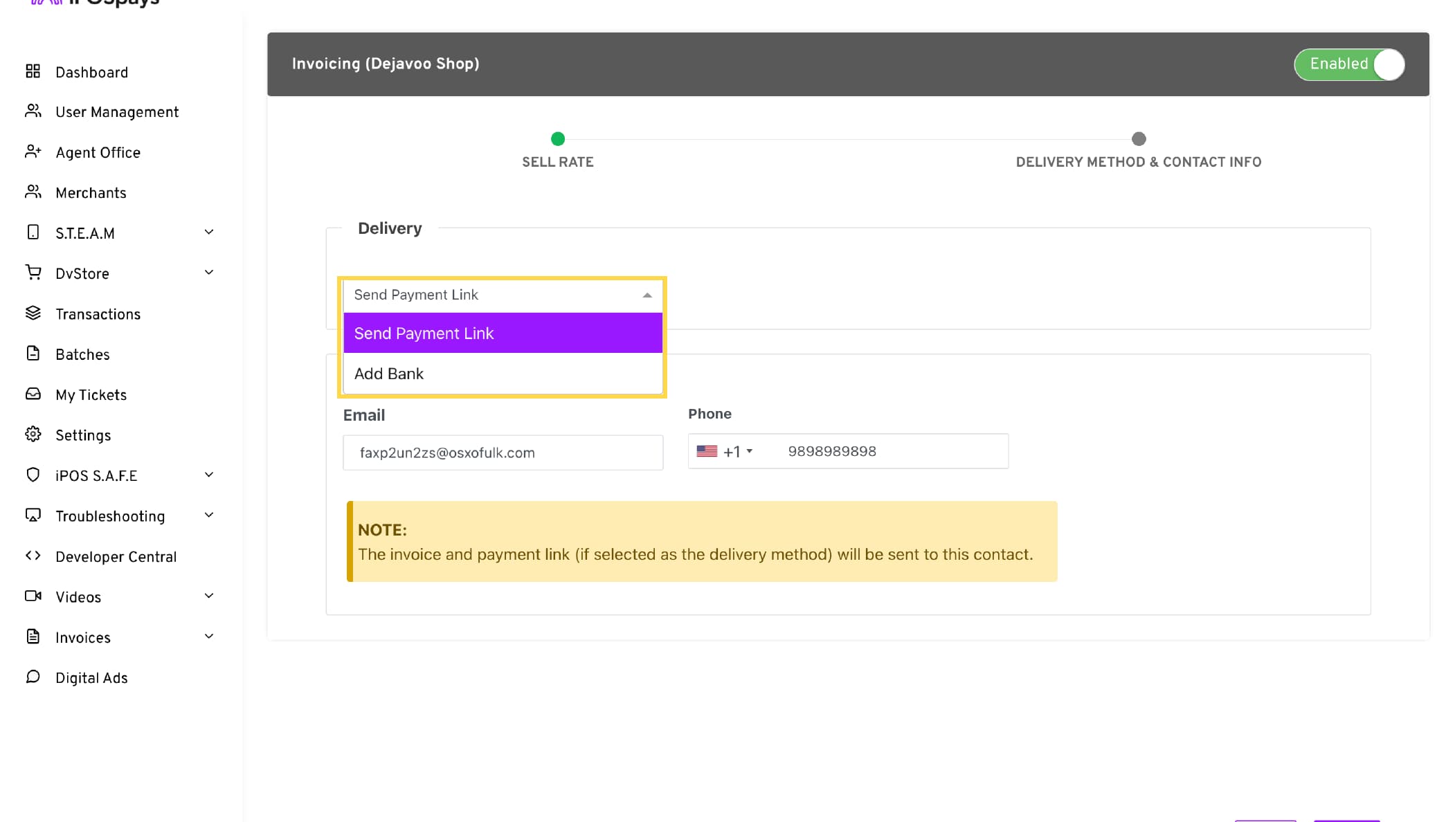 In this section, you can configure the payment delivery method and update the merchant’s contact information.