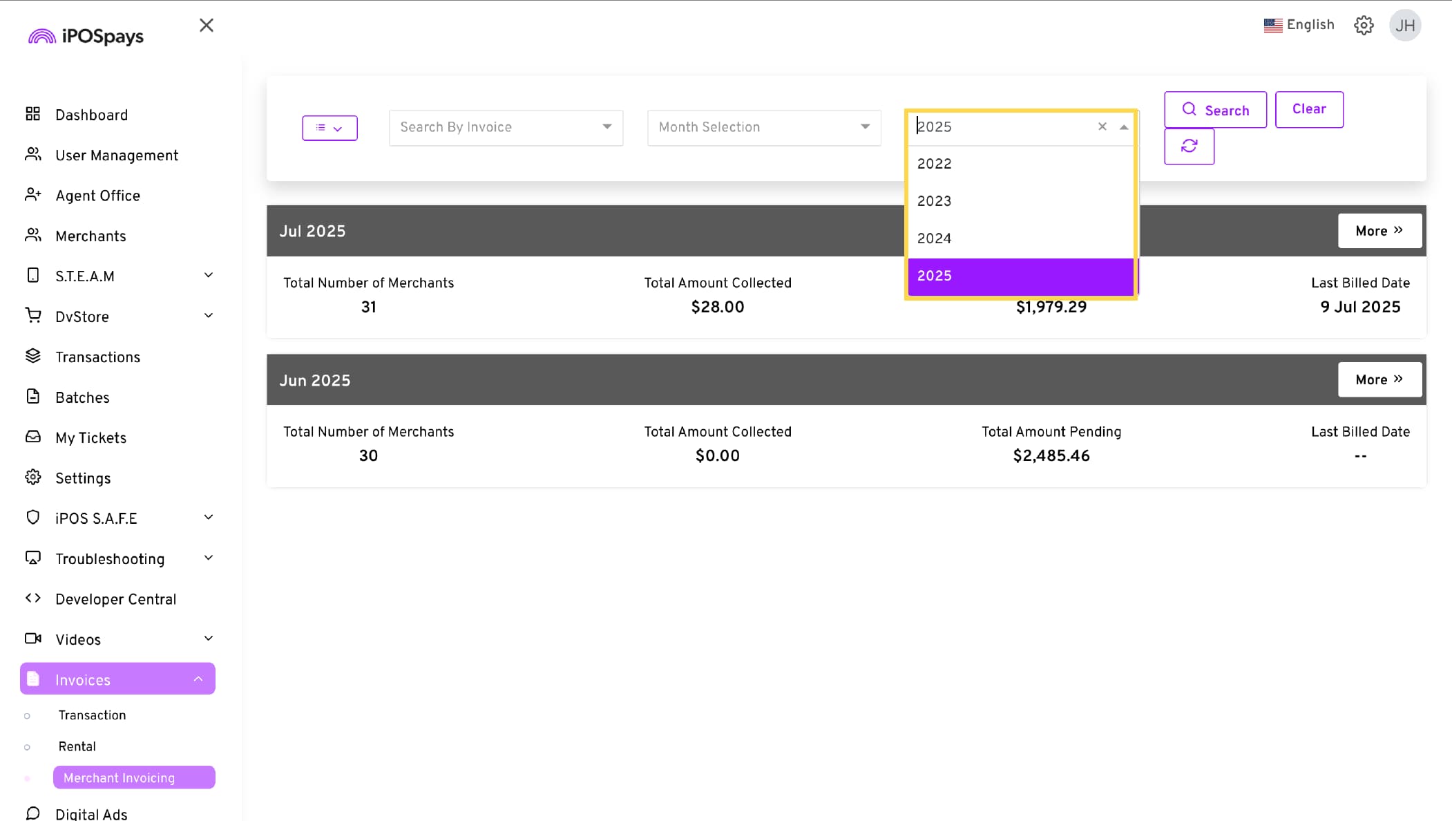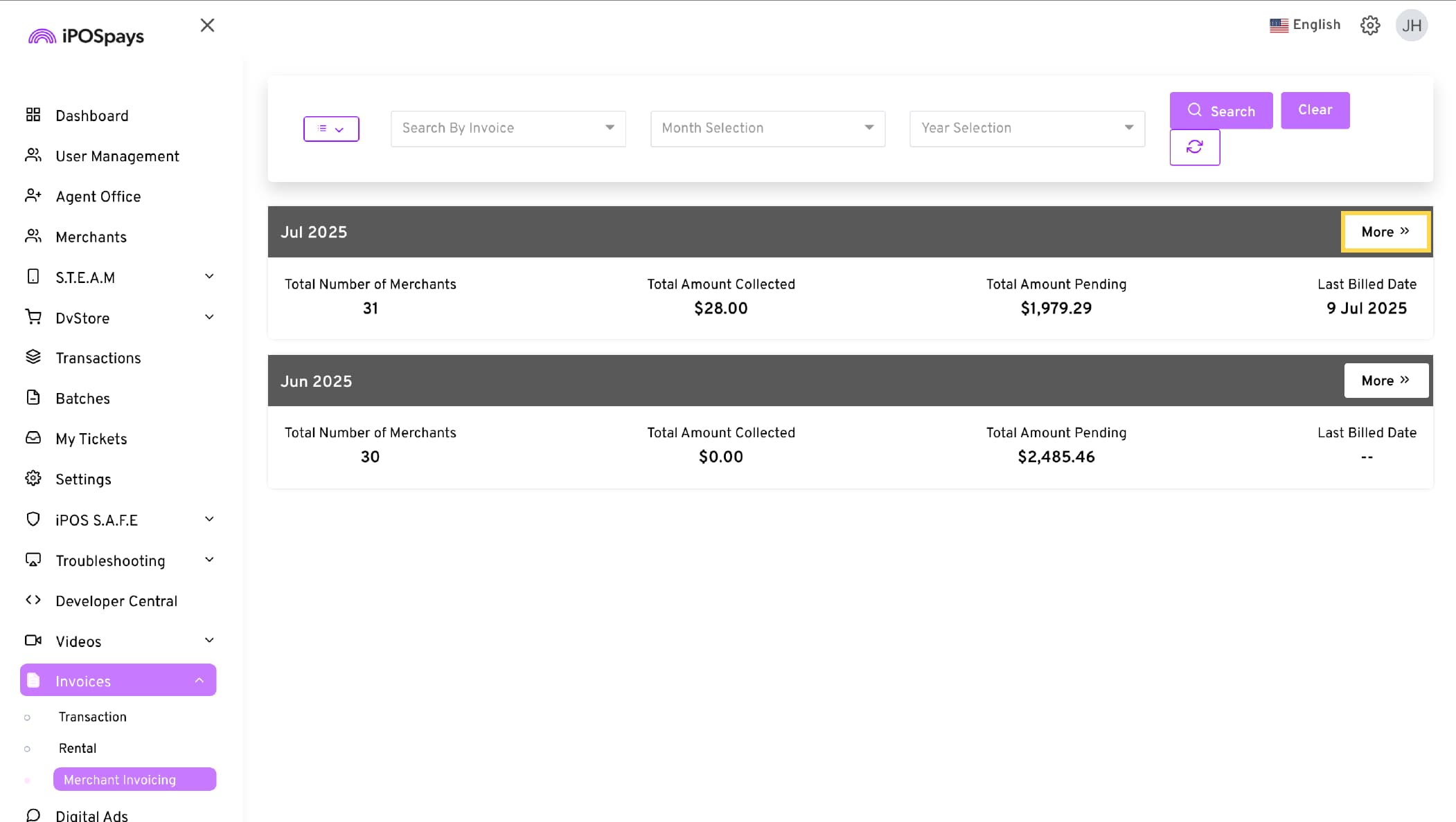 The Merchant Invoicing module has filters and additional information about the invoices generated. To do this,