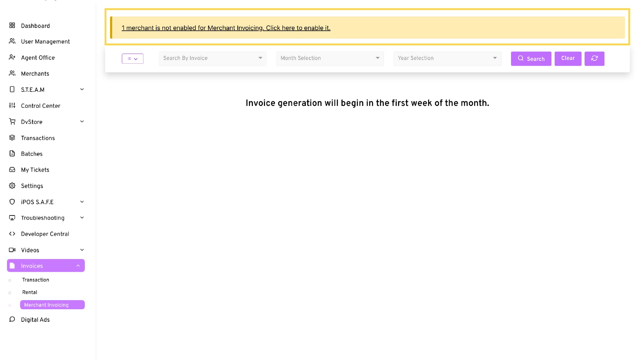 - If you onboard new merchants in the future, a message will appear at the top of the Merchant Invoicing module to remind you that merchant invoicing is not enabled for them. Click on the message to enable merchant invoicing for the new merchants.