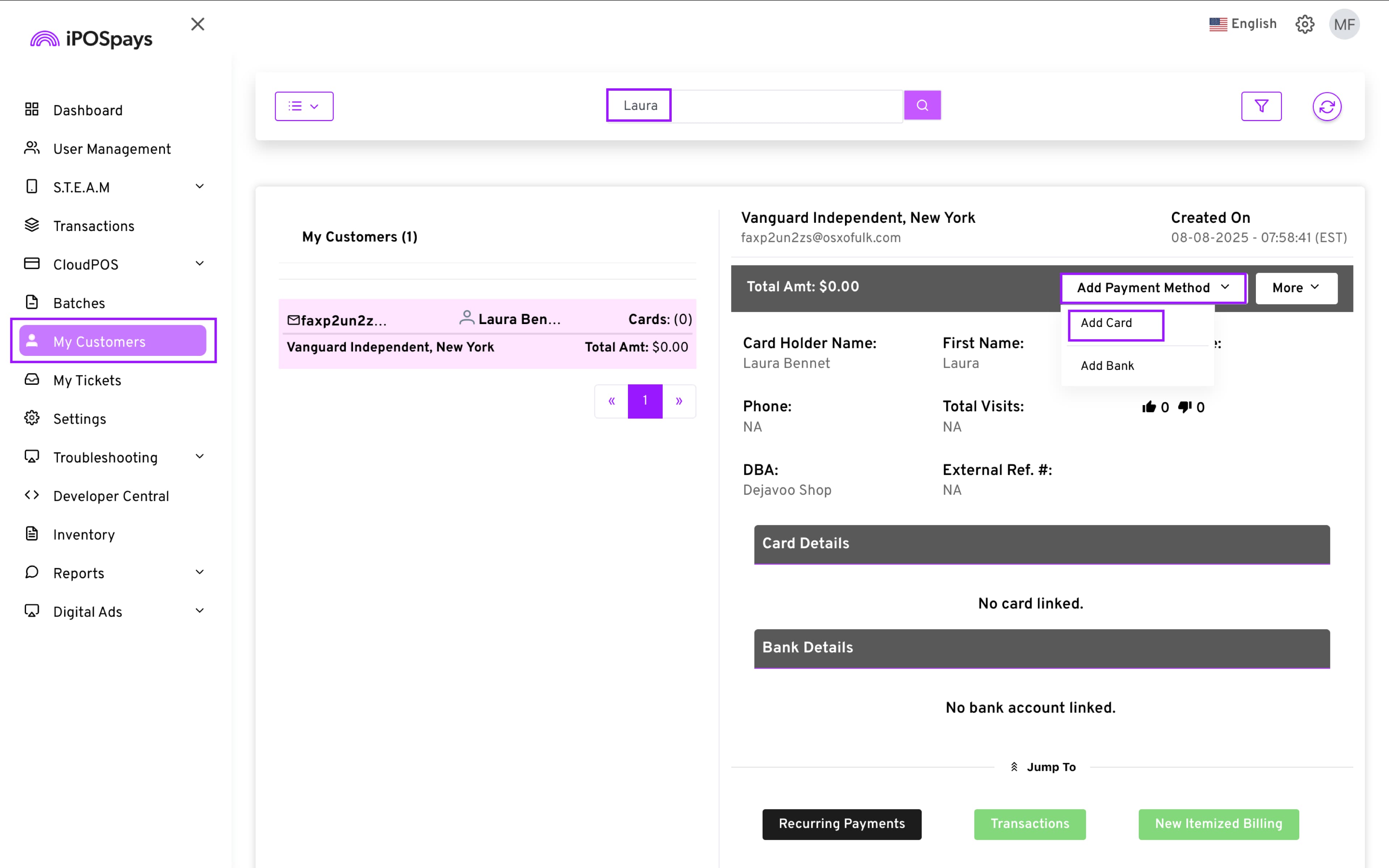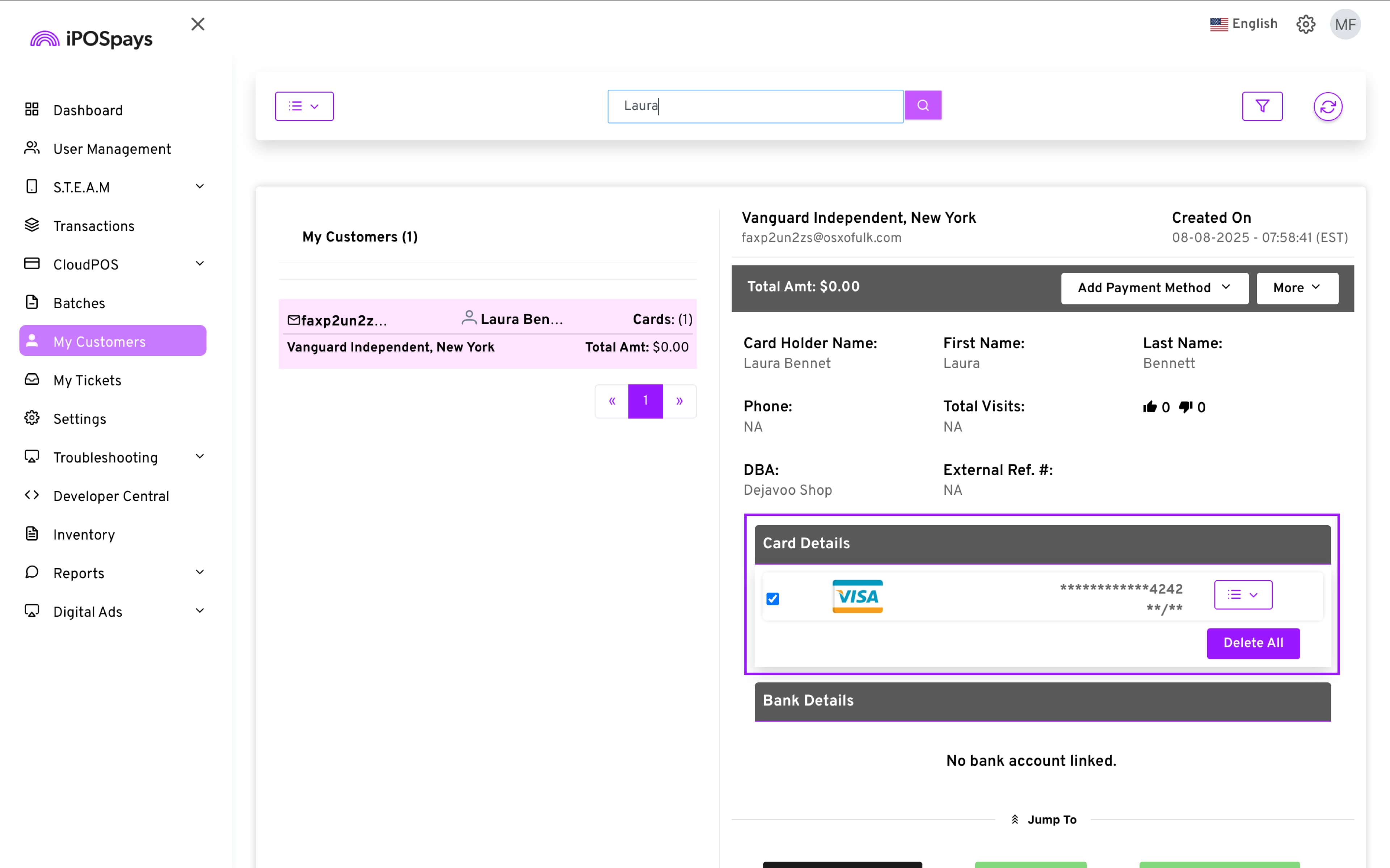 f. The card details will now be saved to that merchant.