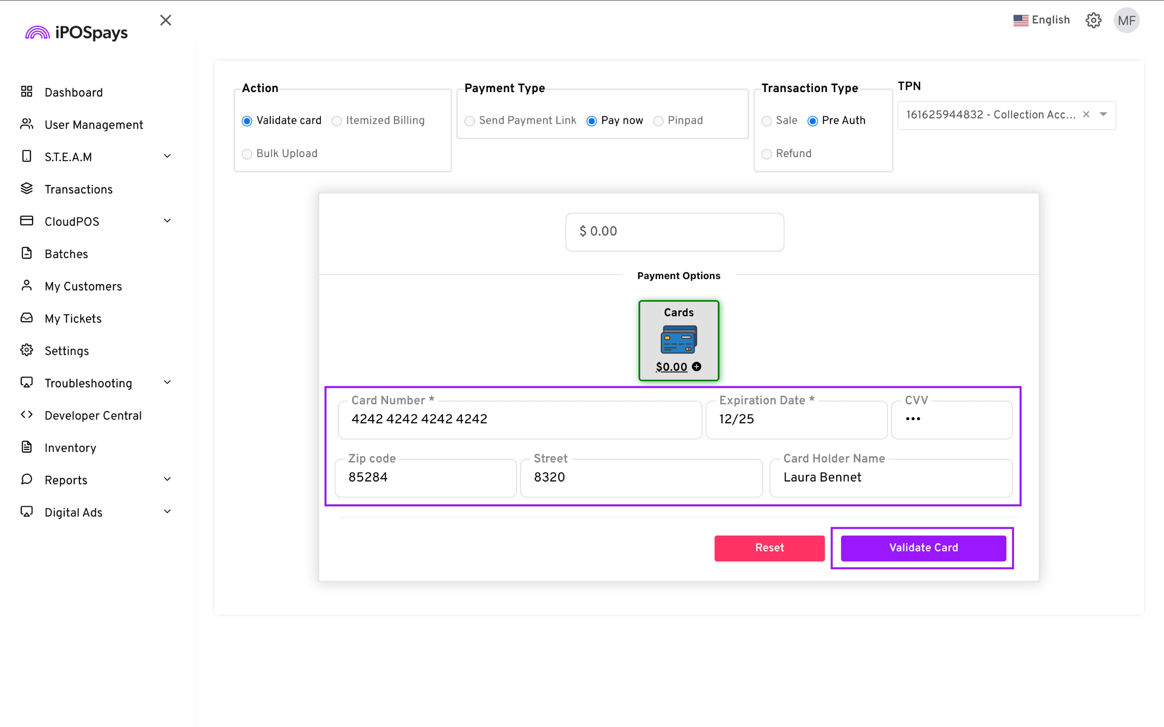 e. Enter the merchant’s card details → Validate Card.