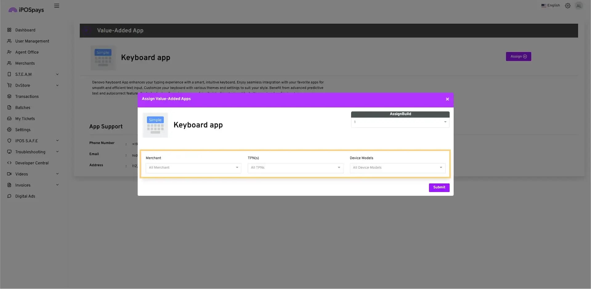 Click on Assign → Choose the merchant, TPN, and device for which you wish to assign the app. Alternatively, you can choose a merchant and assign it to all TPNs and device models as well.