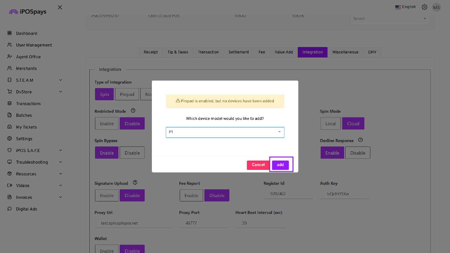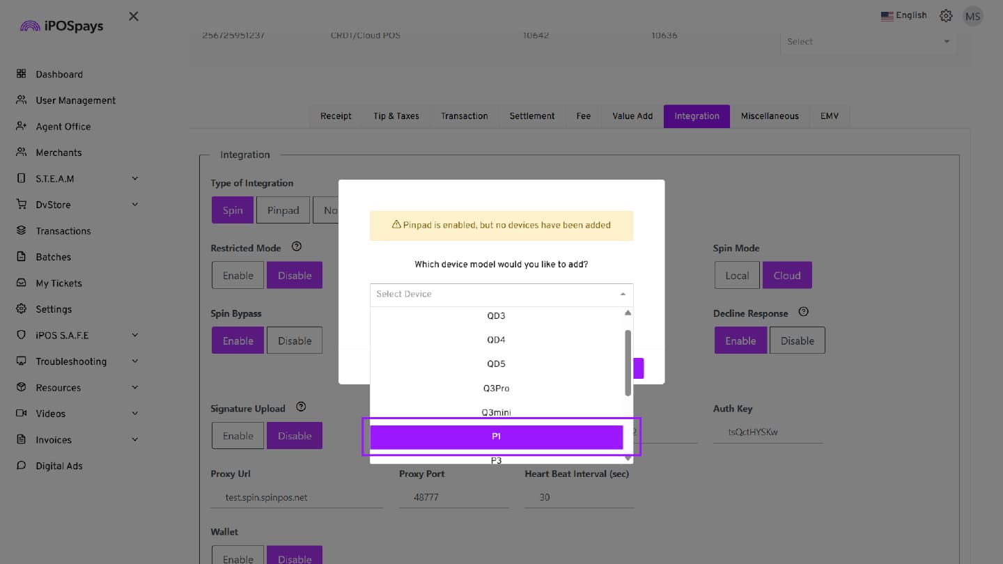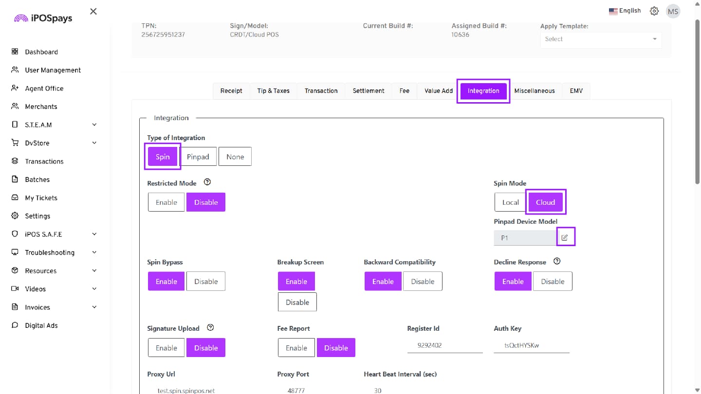 To integrate a PIN pad with a merchant’s CloudPOS TPN, the ISO must enable SPIn integration from the iPOSpays portal.