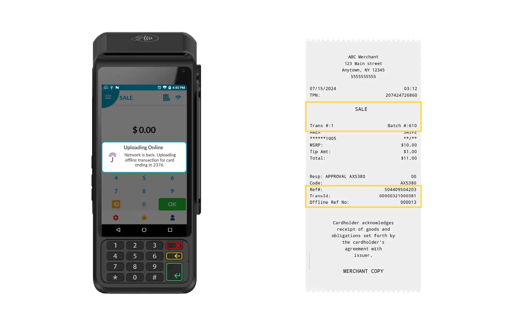 The custom message configured during offline mode setup (e.g., “Pending Upload”) will be displayed on the receipt.