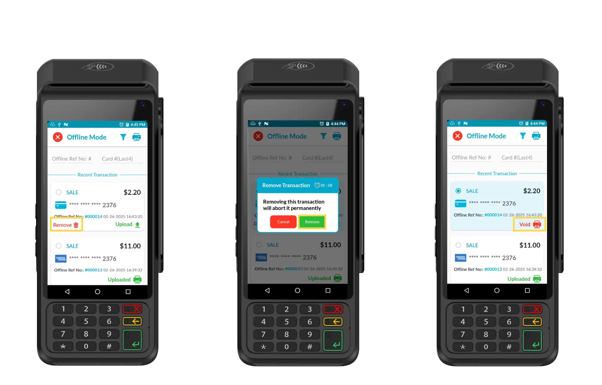 Merchants can manually remove offline transactions after completion.