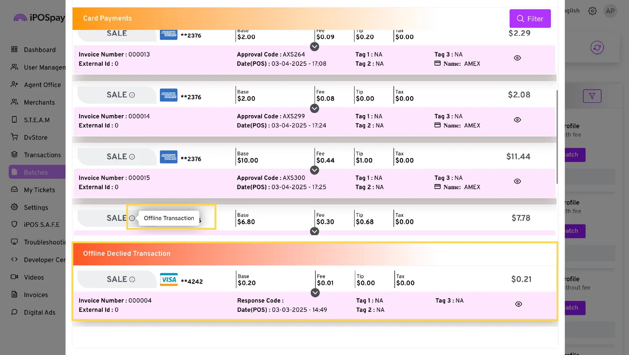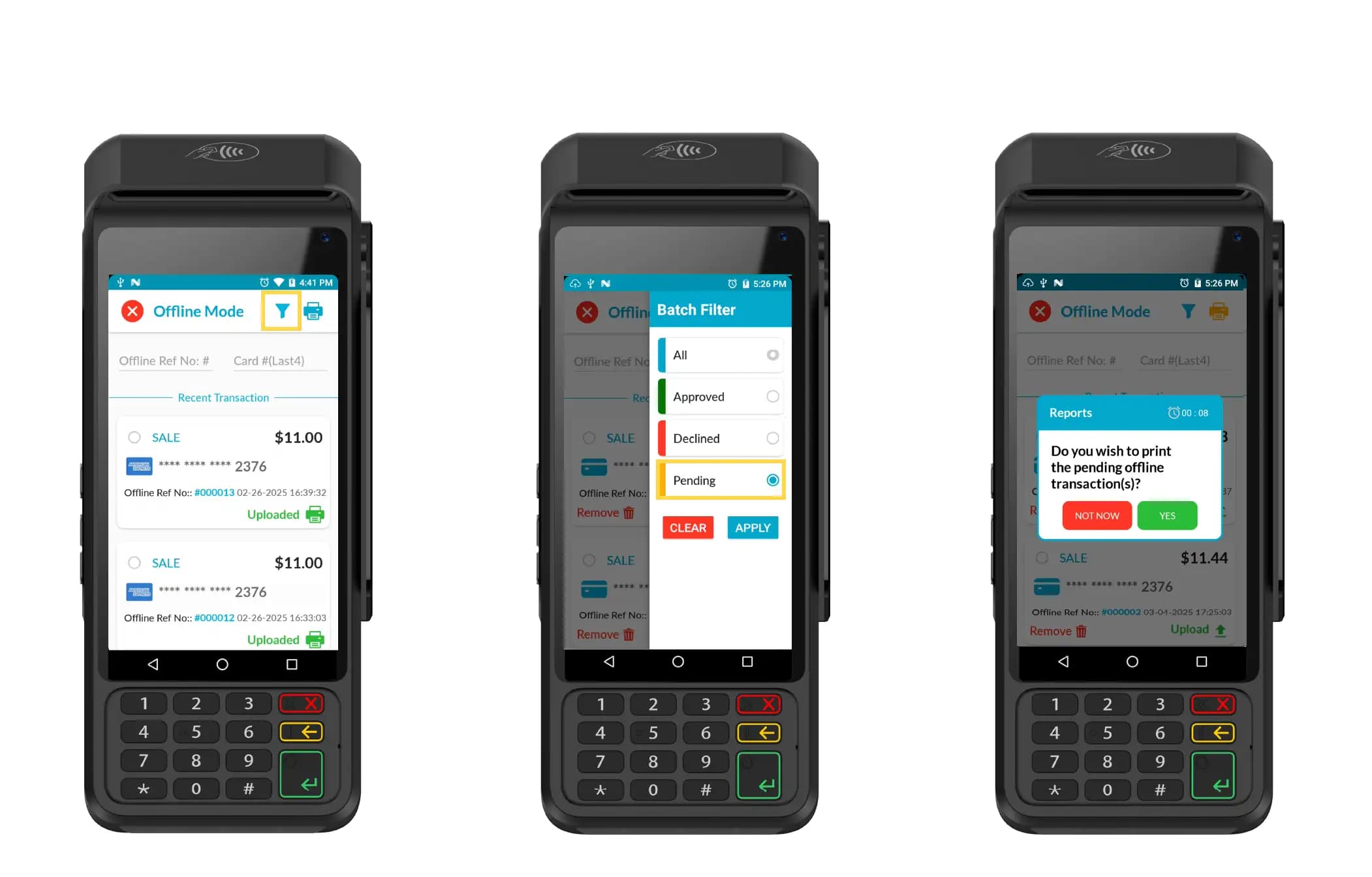 Merchants can filter offline transactions based on their status and print reports.