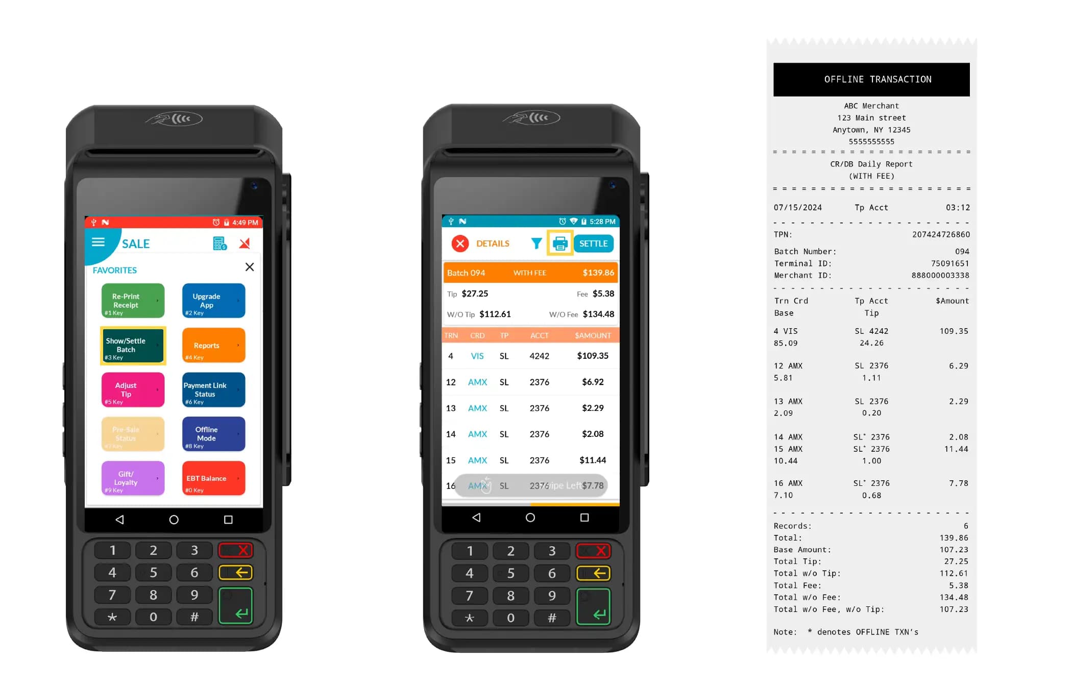 Offline transactions appear in PDF settlement reports.