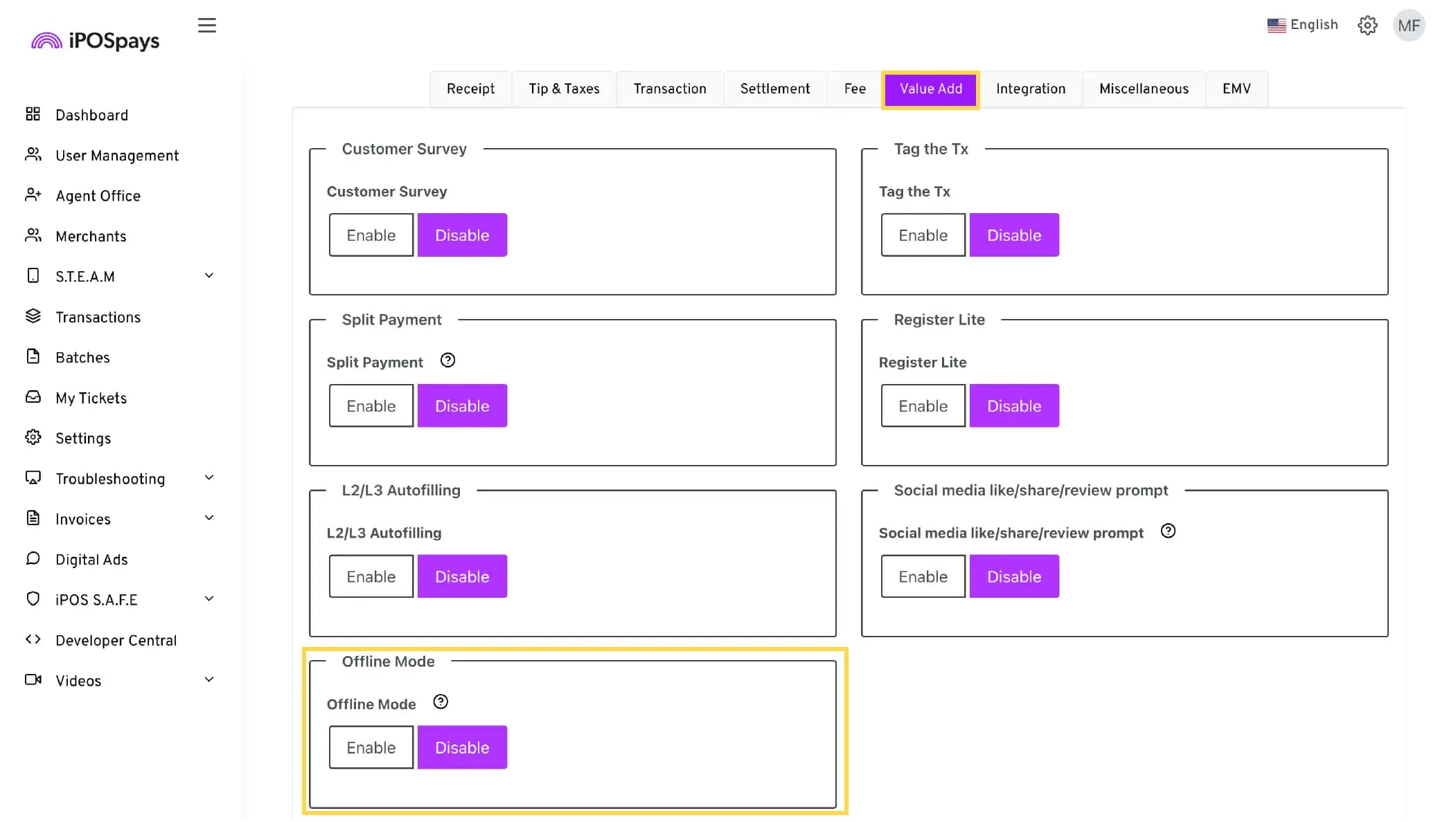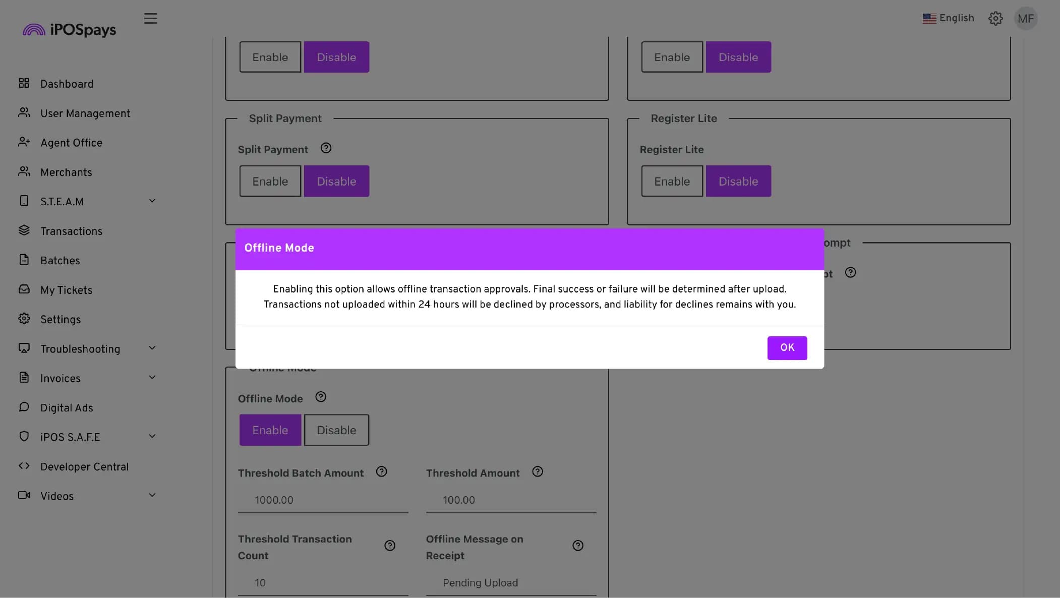 To enable Offline Mode, the ISO must activate it for the merchant’s TPN from the iPOSpays portal.
