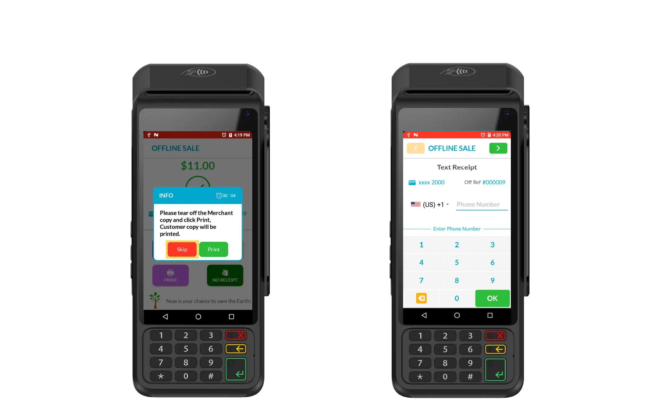 The receipt for an offline sale will be labeled OFFLINE SALE, whereas a standard transaction receipt will display SALE.