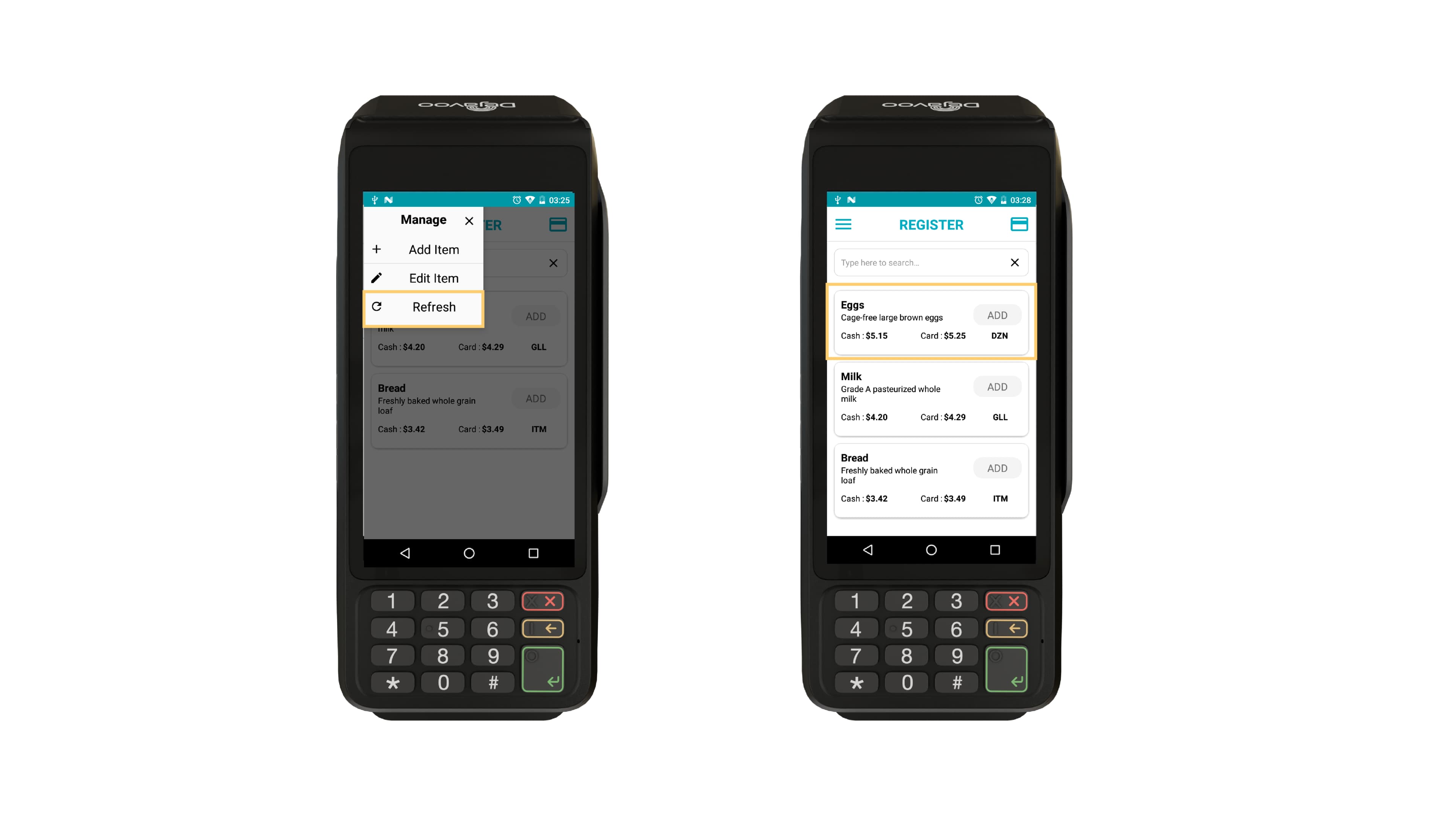 - Tap the menu button → Refresh to sync any items recently added to the inventory from the iPOSpays portal.