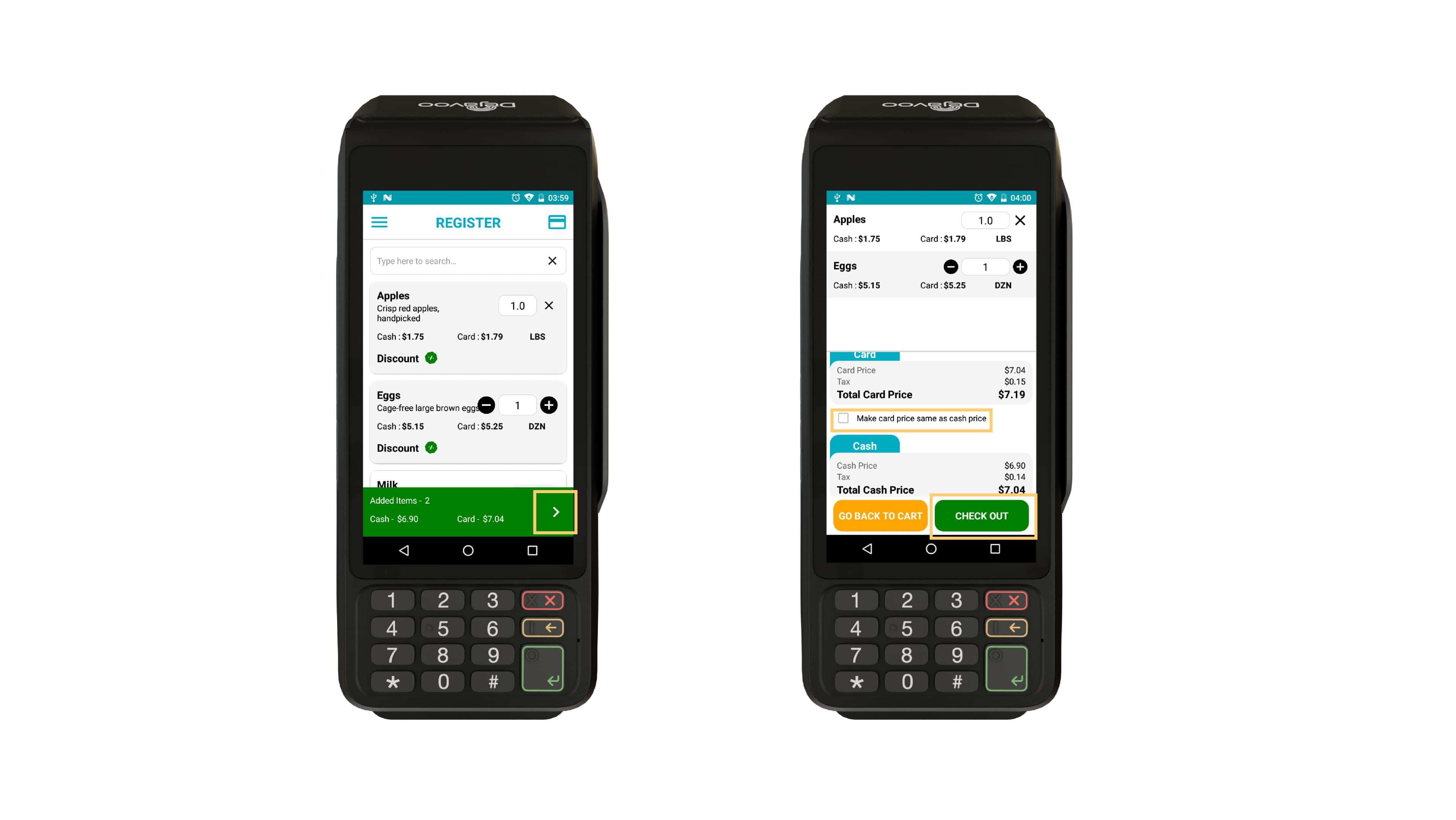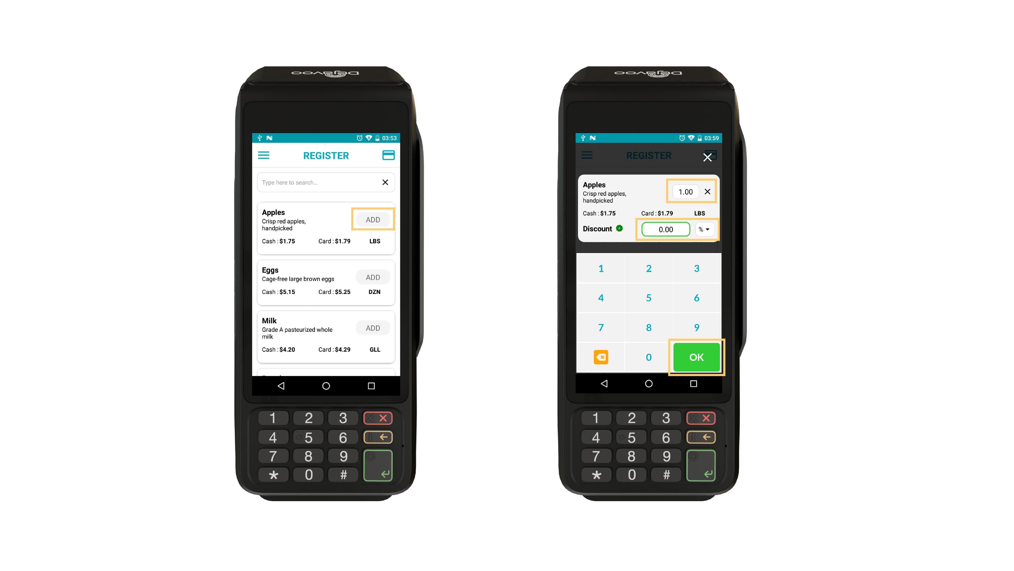 From the Register screen, tap Add to add items to the cart