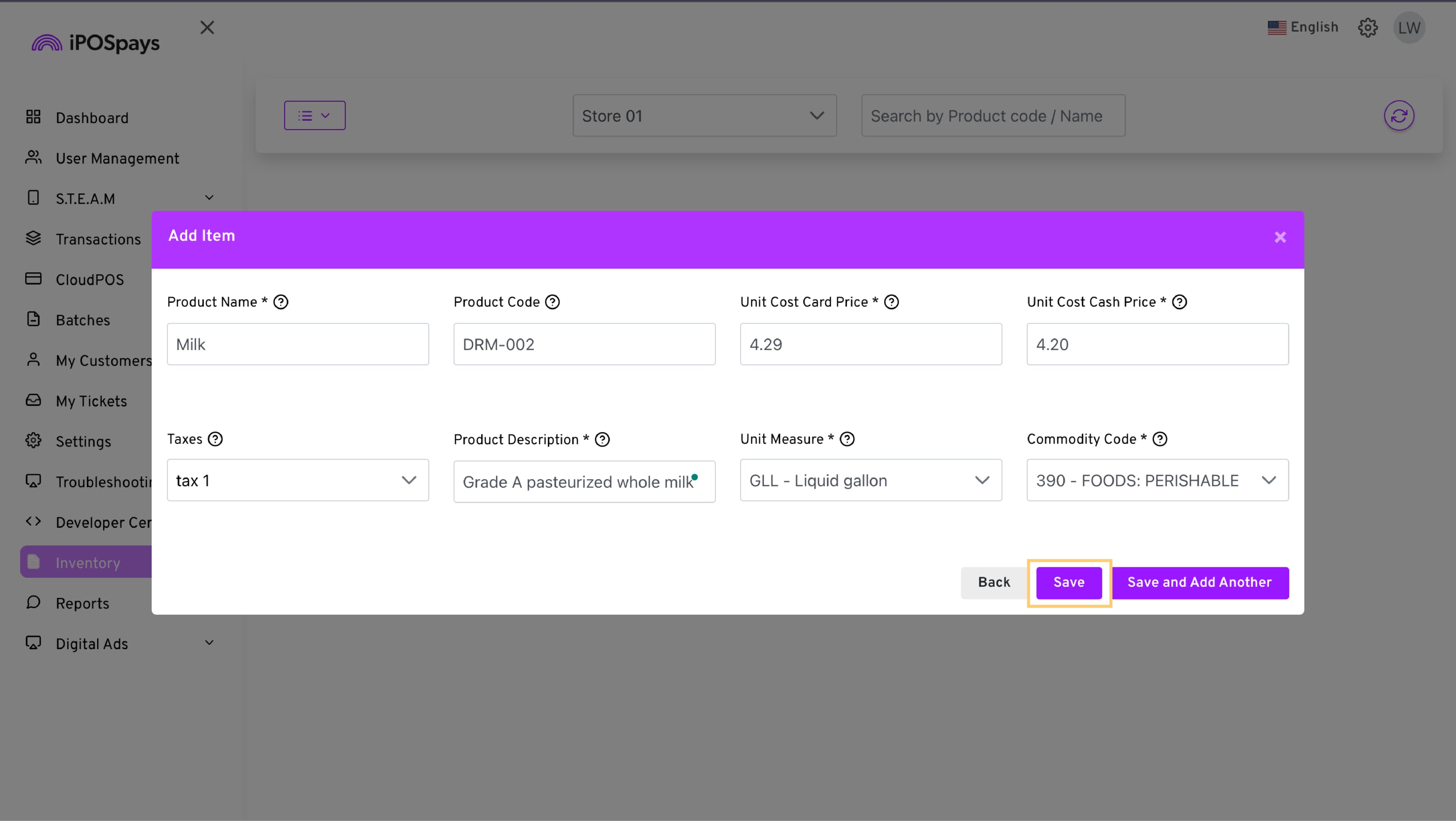 Enter the product name and product code manually or scan the barcode by tapping on the scanner icon.