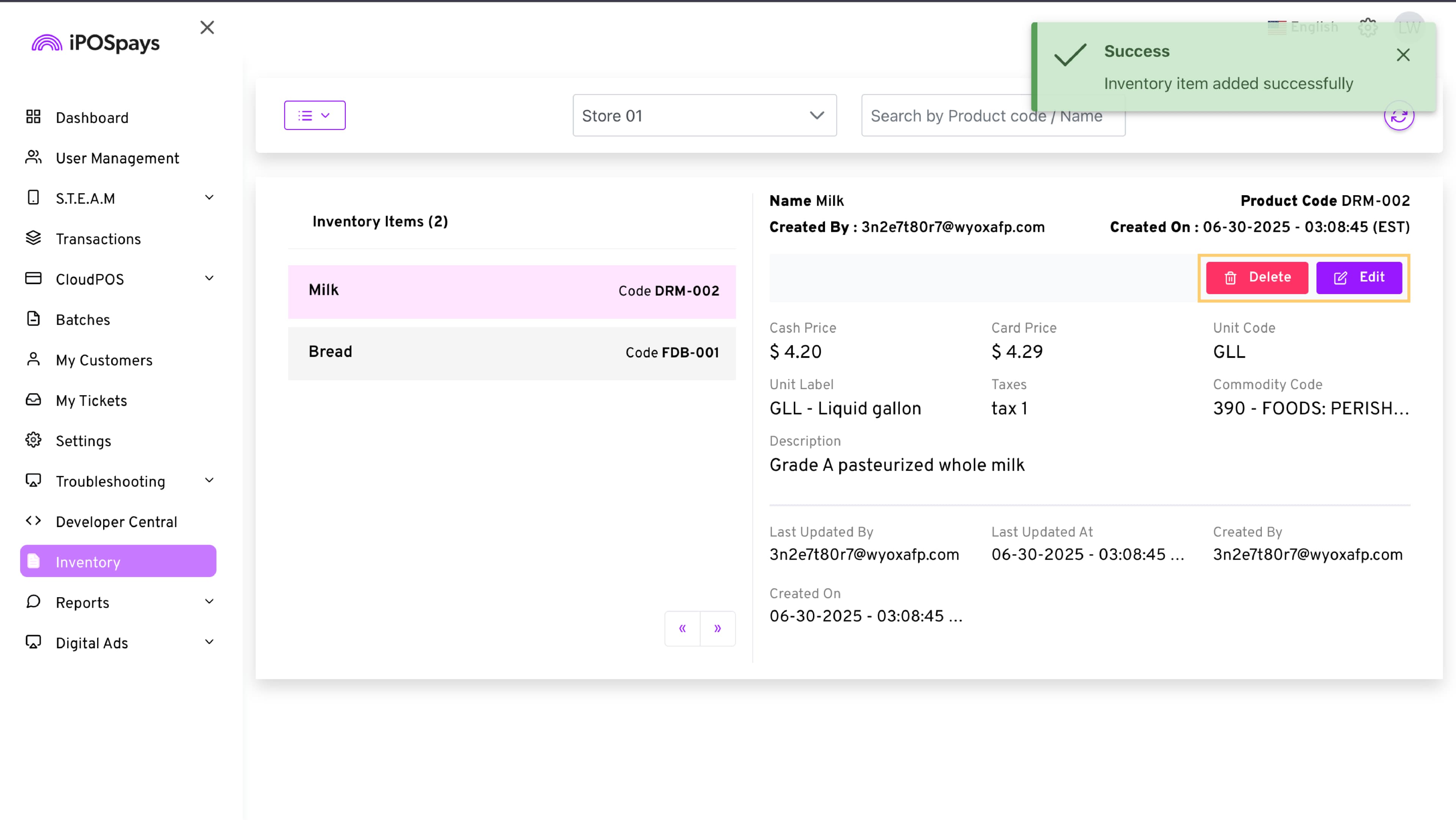 After the items have been added to the inventory, you can edit or delete the items from the Inventory module.