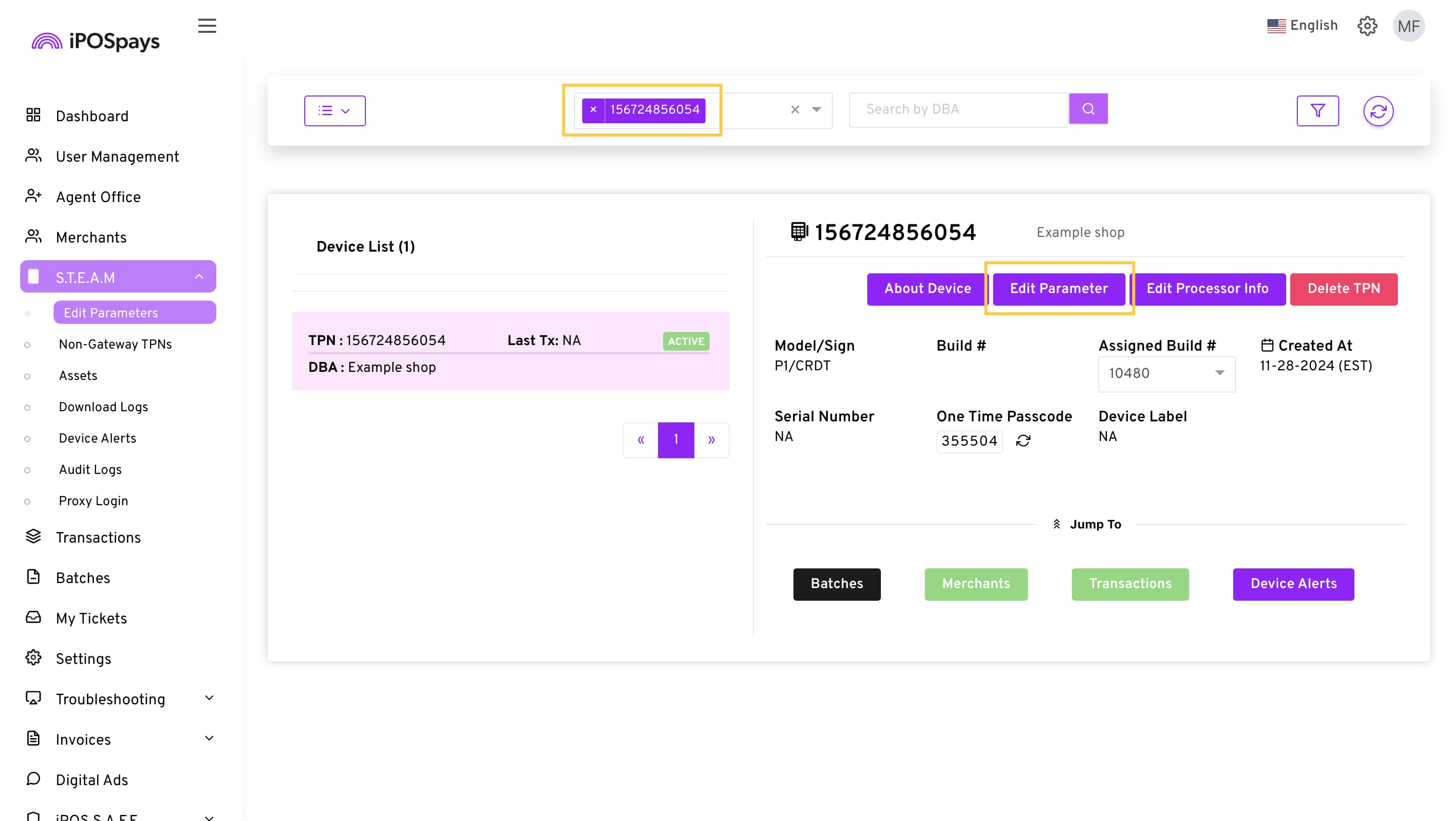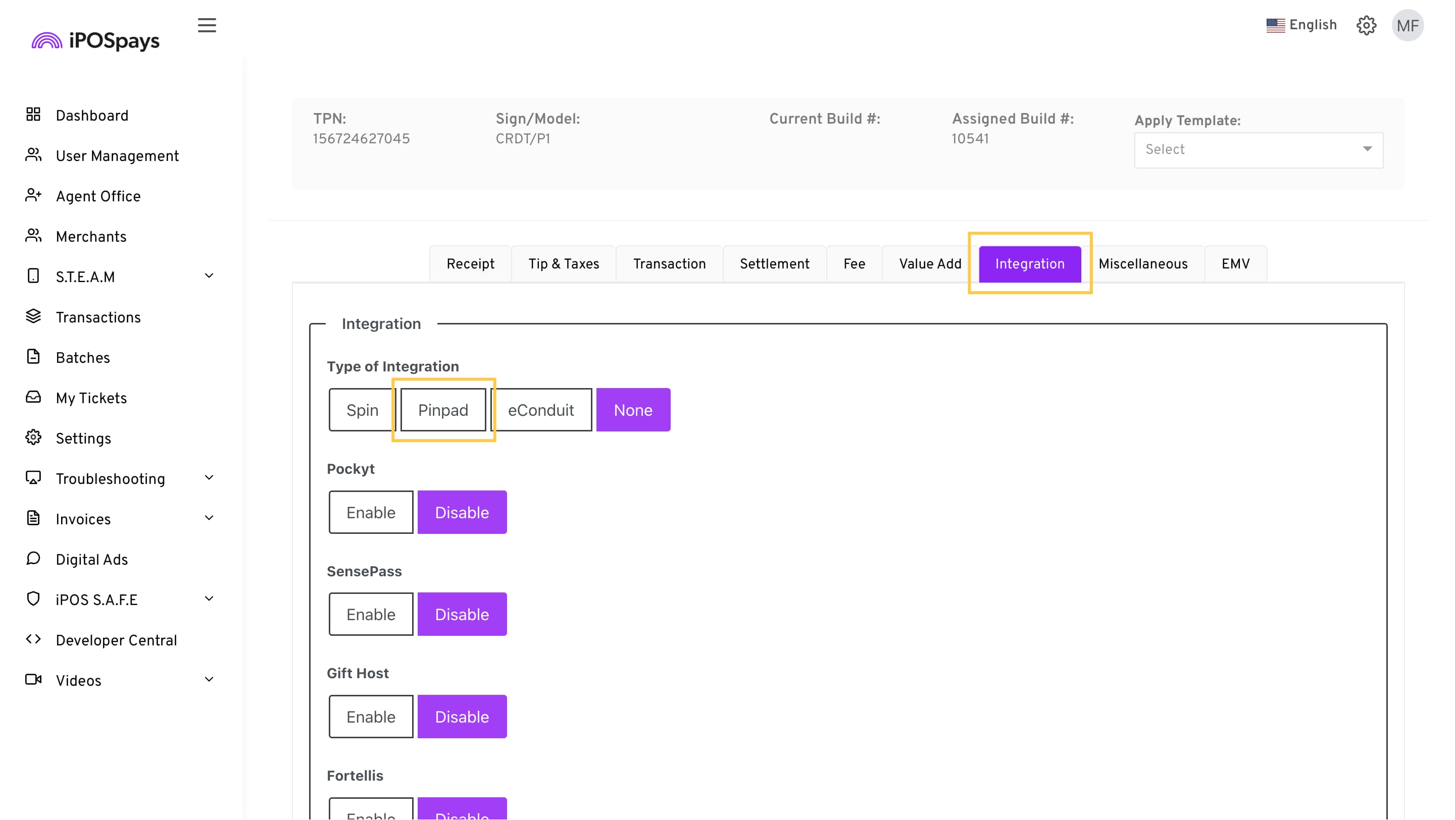 To enable and integrate a PIN pad terminal (P17) with the master payment terminal (P1), the ISO must activate PIN pad mode for the TPN assigned to the master terminal. This configuration is done through the iPOSpays portal. Follow the steps below to complete the setup.
