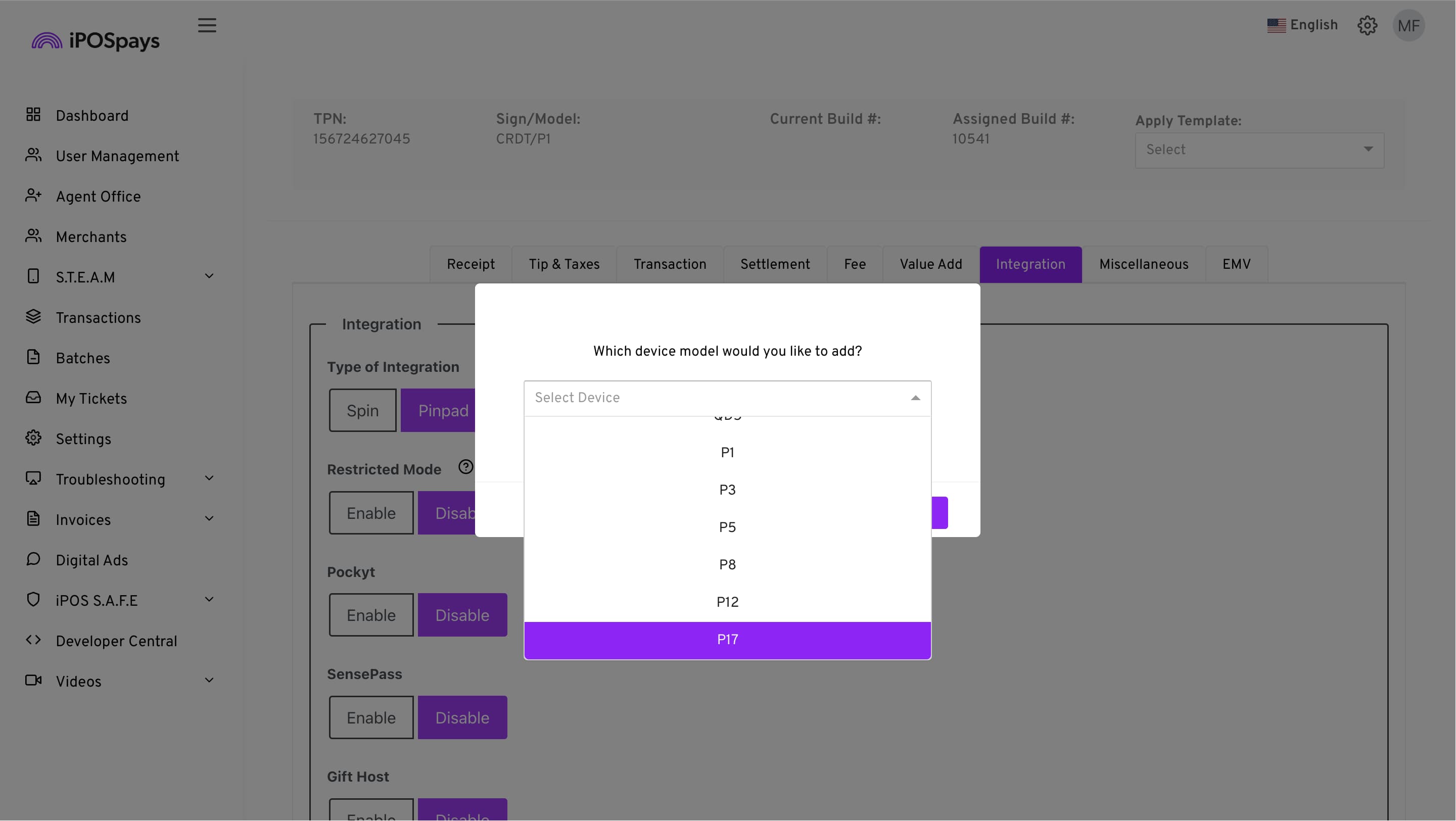 - When PIN pad Mode is selected or enabled from the “Type of Integration” options, a dropdown menu will automatically appear. From this menu, select the desired PINpad device to pair with—choose P17.