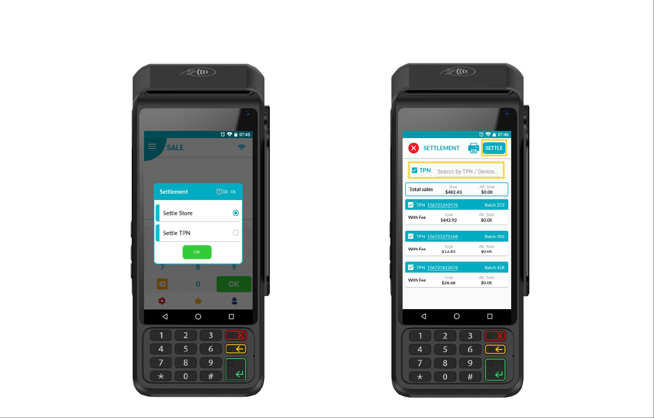 Select all TPNs or choose specific ones using the search box, then tap Settle to process the batch settlement.