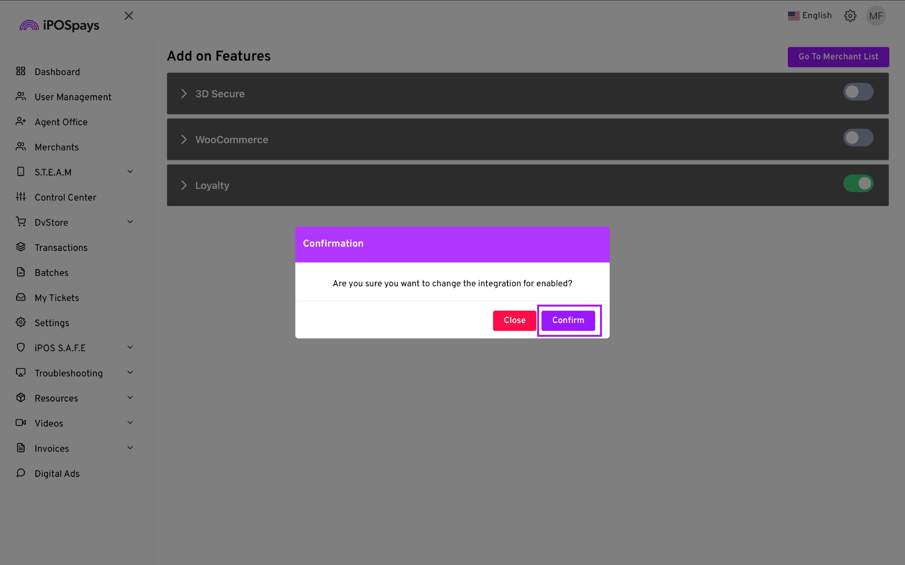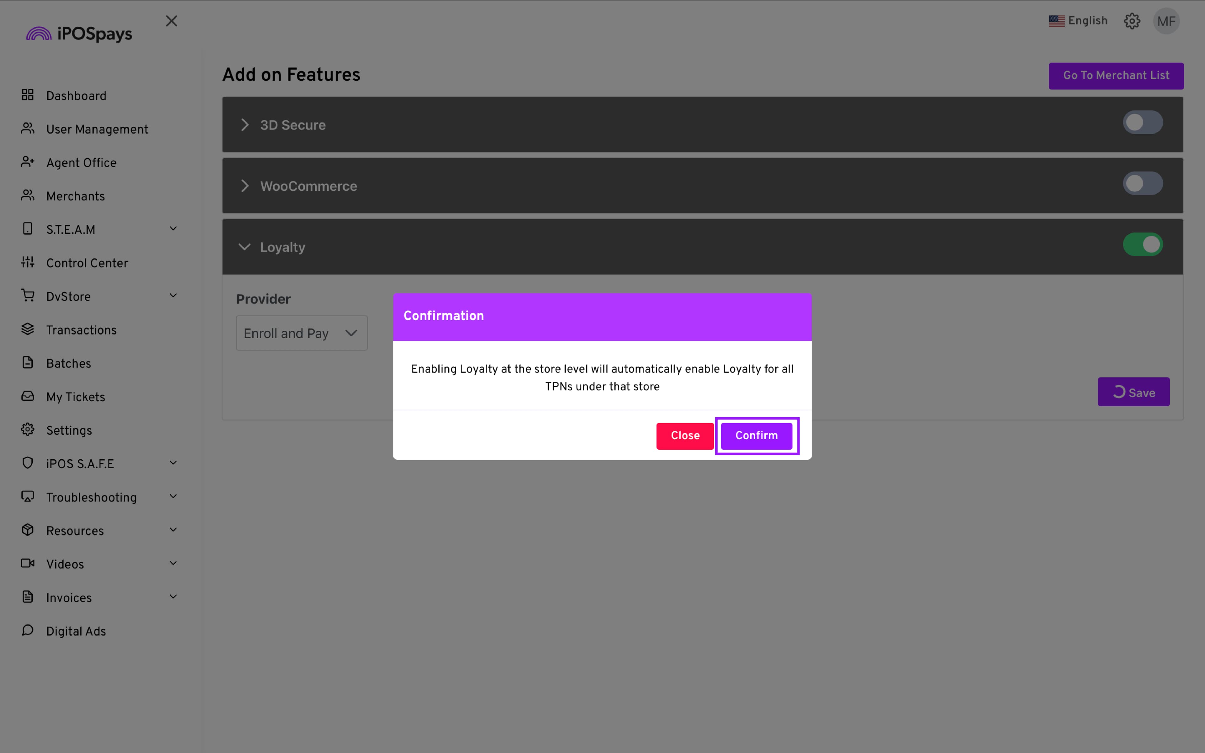 Confirm the prompt acknowledging that the feature will apply to all terminals (TPNs) for the store.