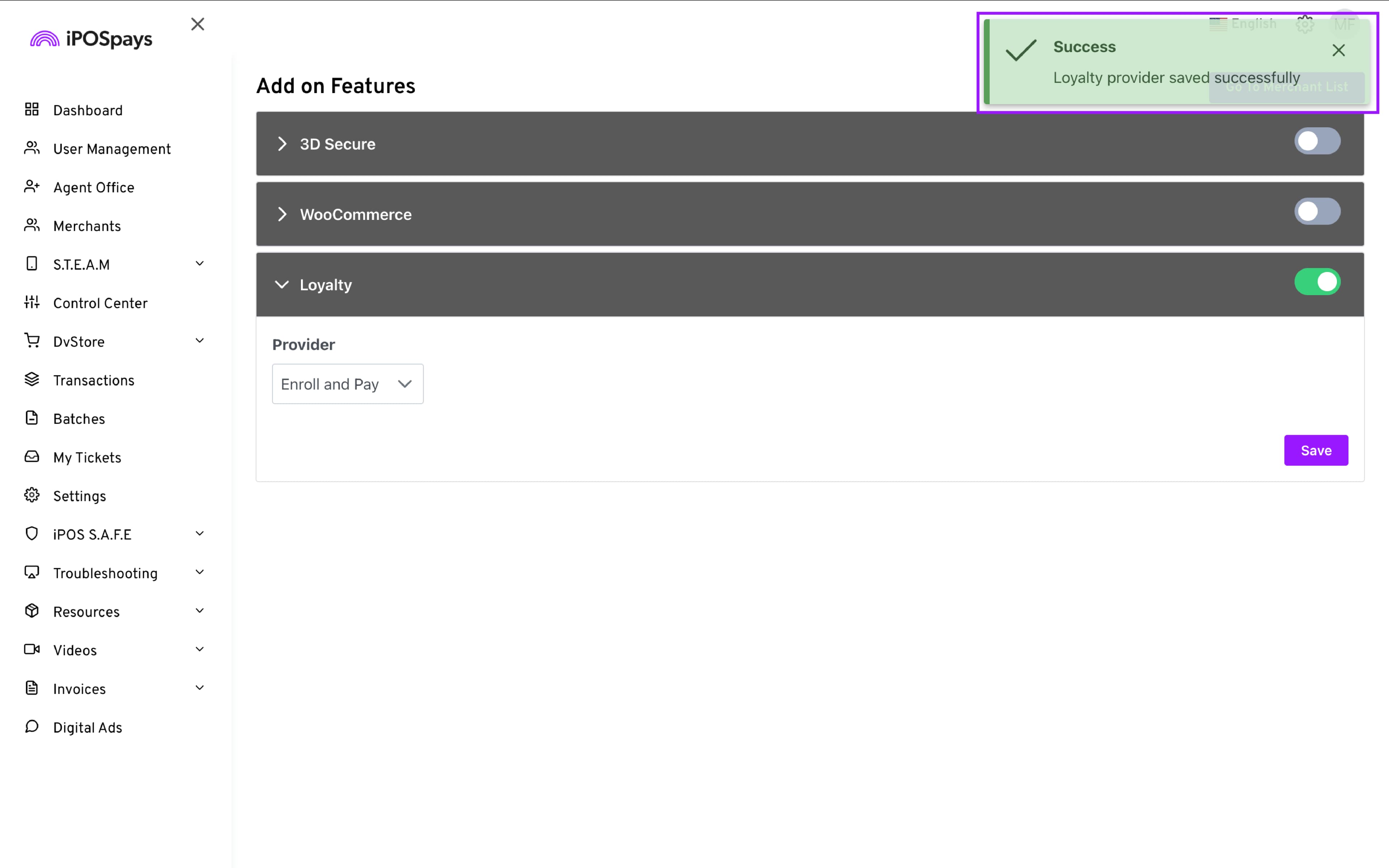 Navigate to the Add-On Features section in the iPOSpays portal.