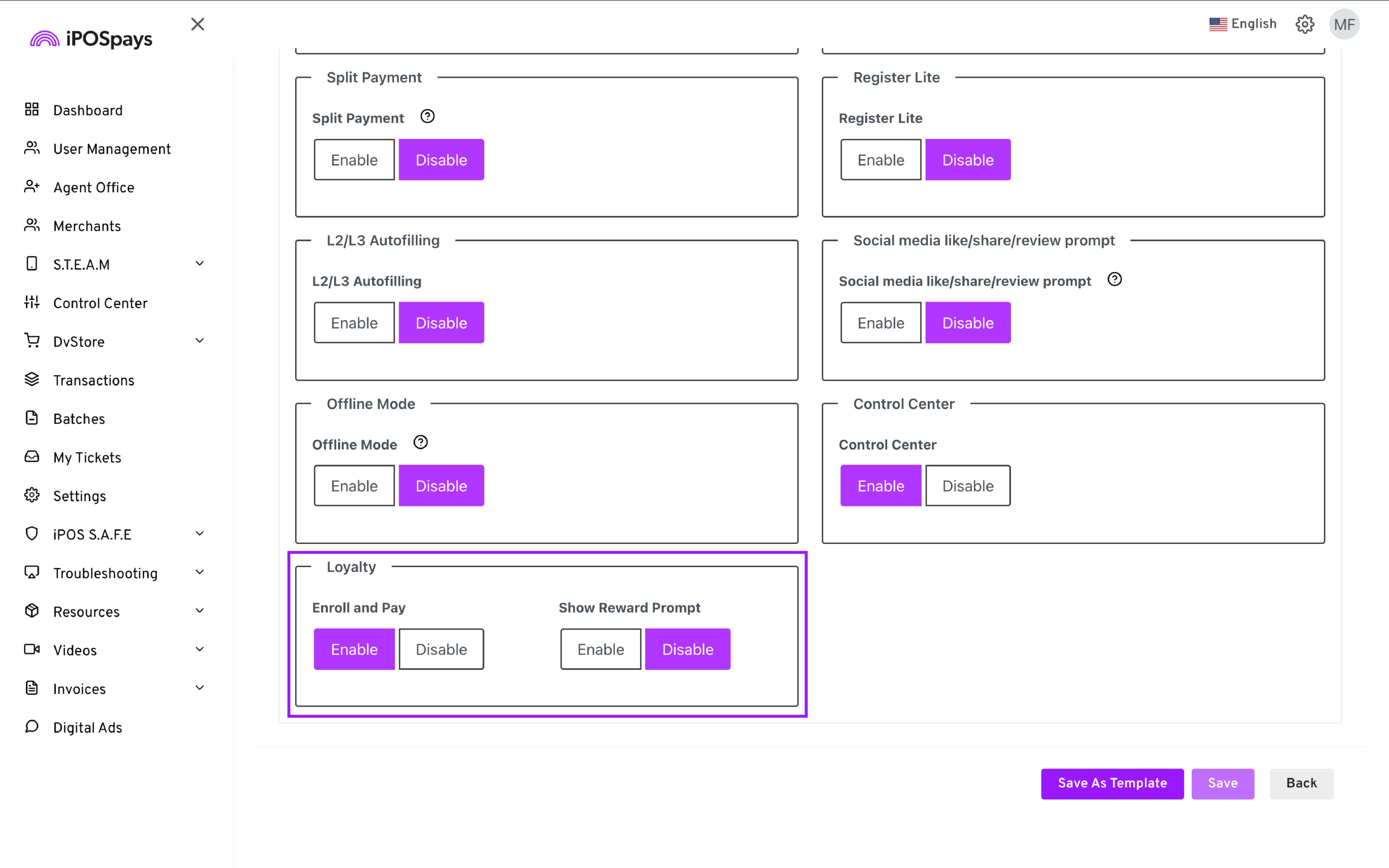Navigate to Value Add → Loyalty and enable Enroll & Pay.