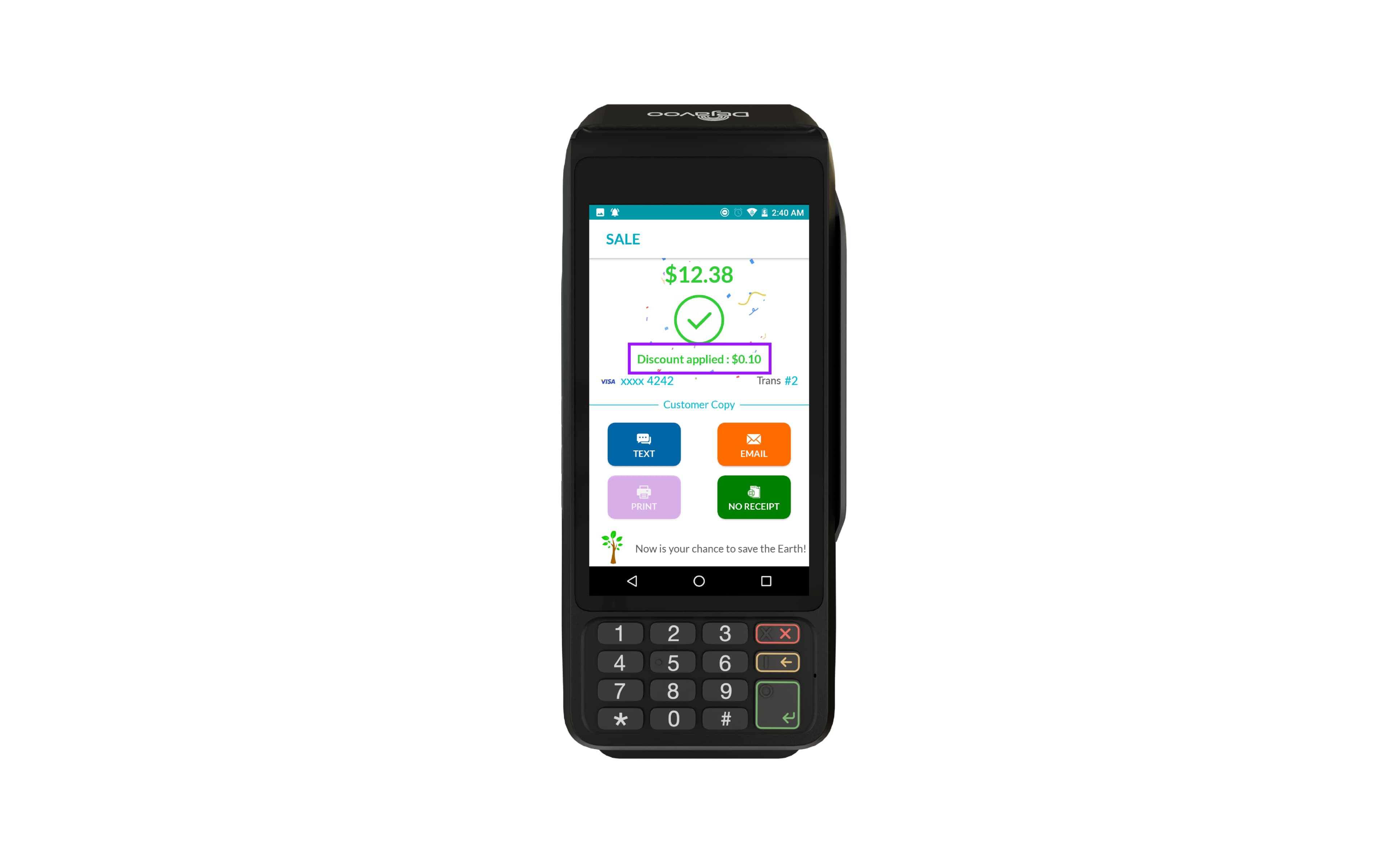 For returning customers, the configured loyalty discount is applied whenever the same card is used.