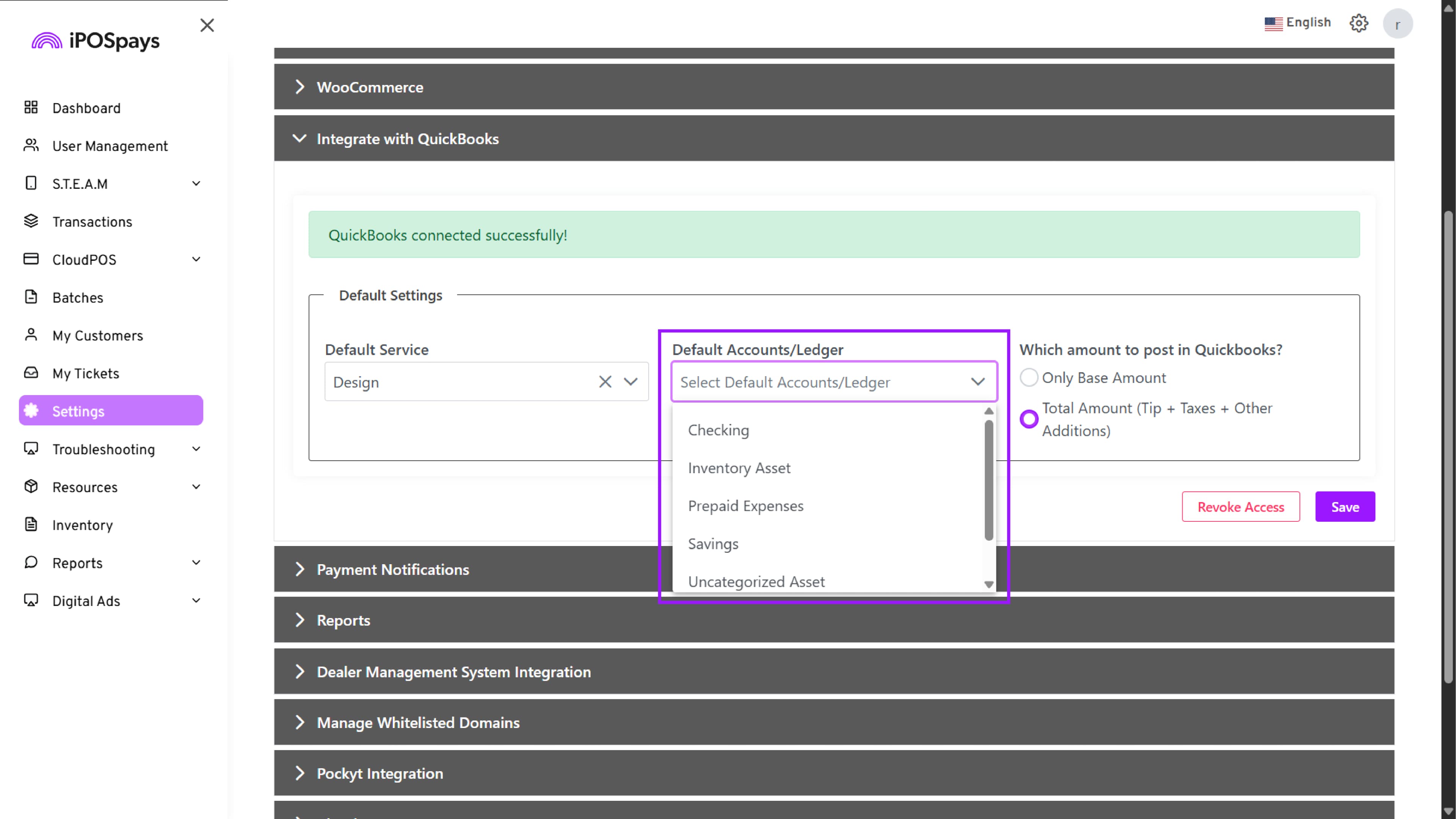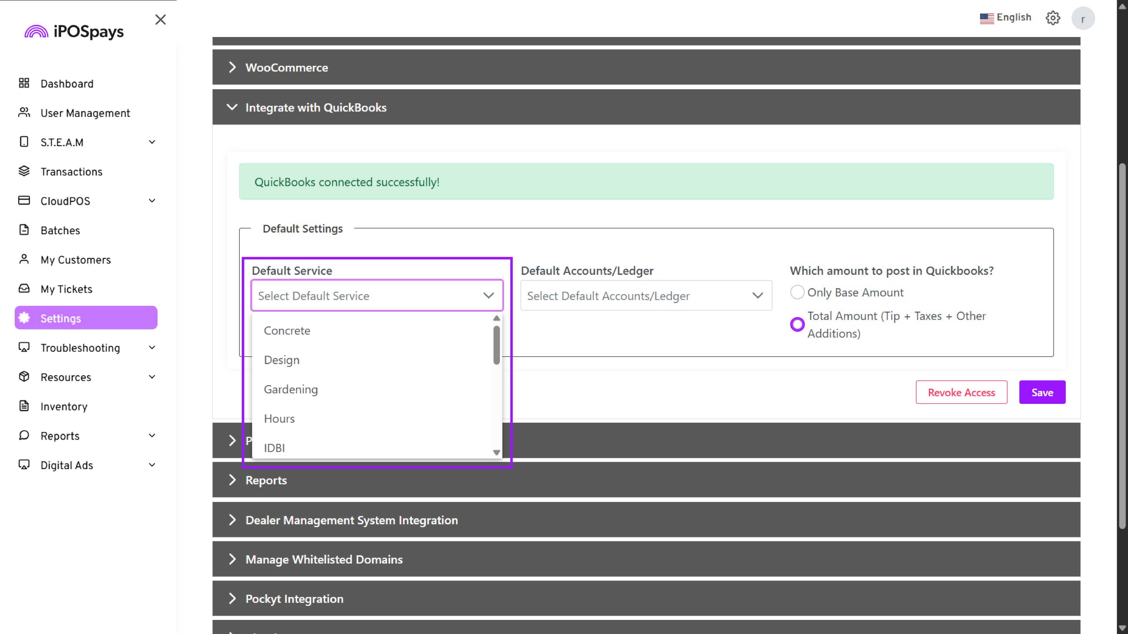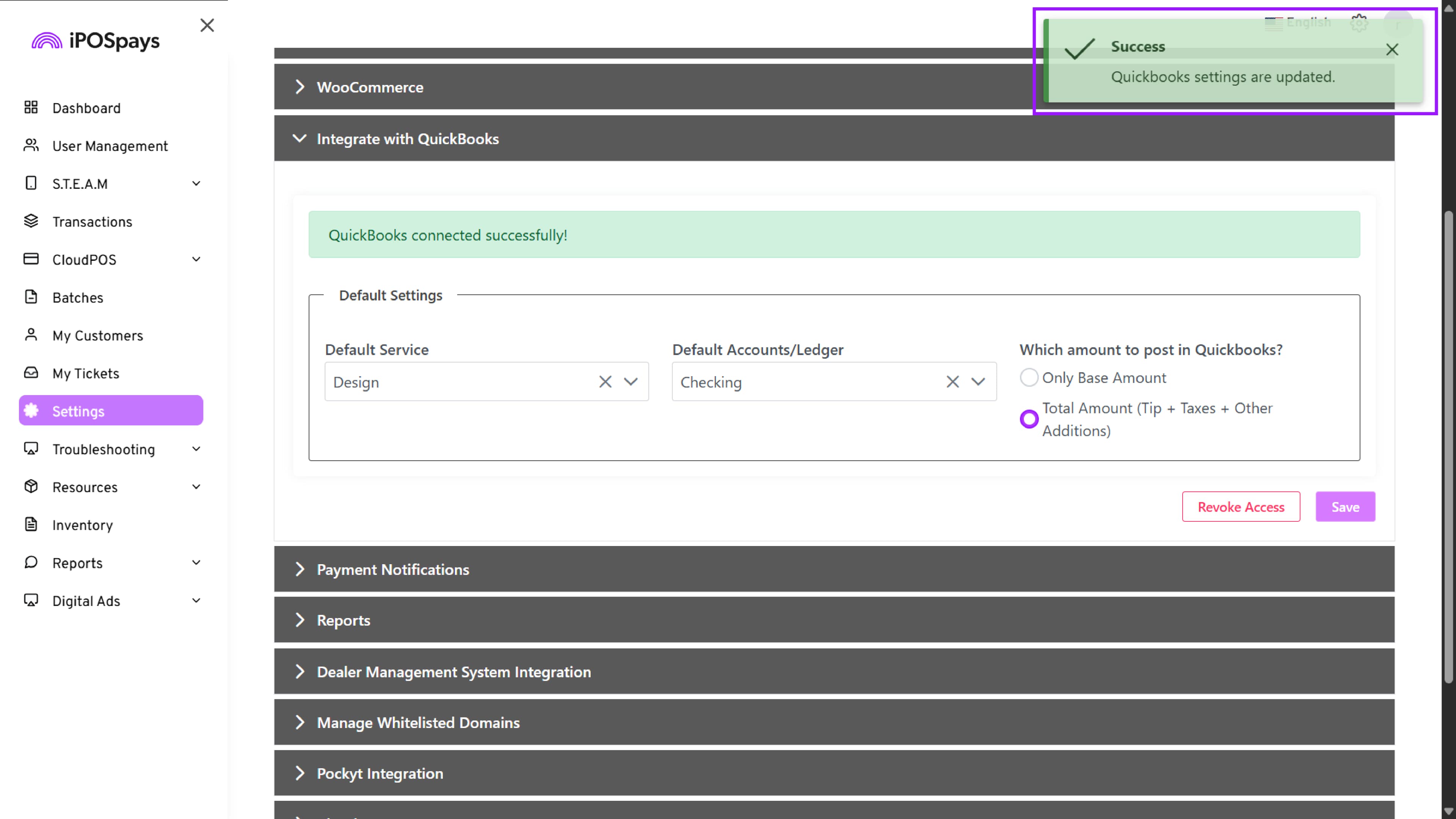 Select Revoke Access to disconnect the linked Quickbooks account from iPOSpays.