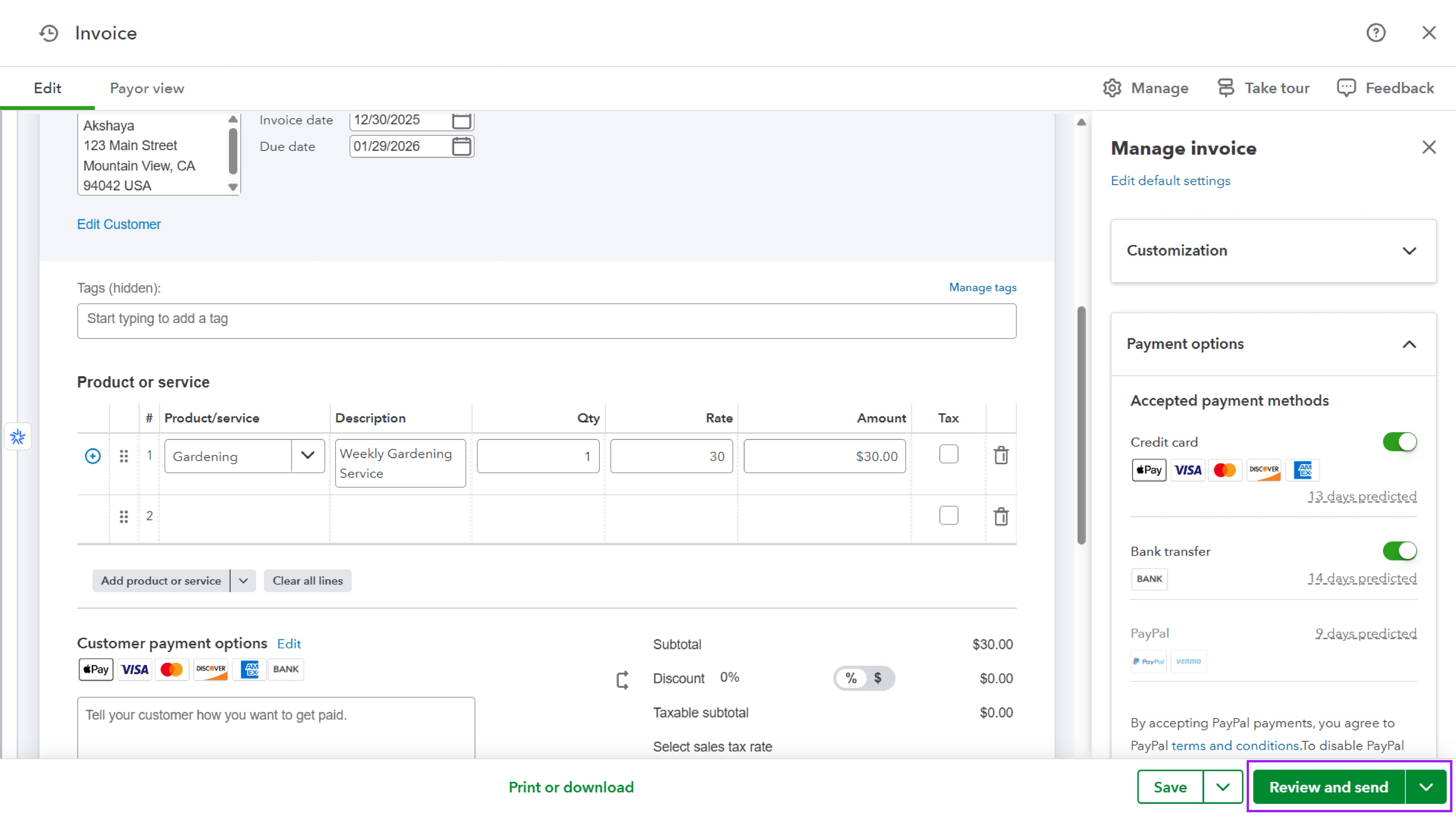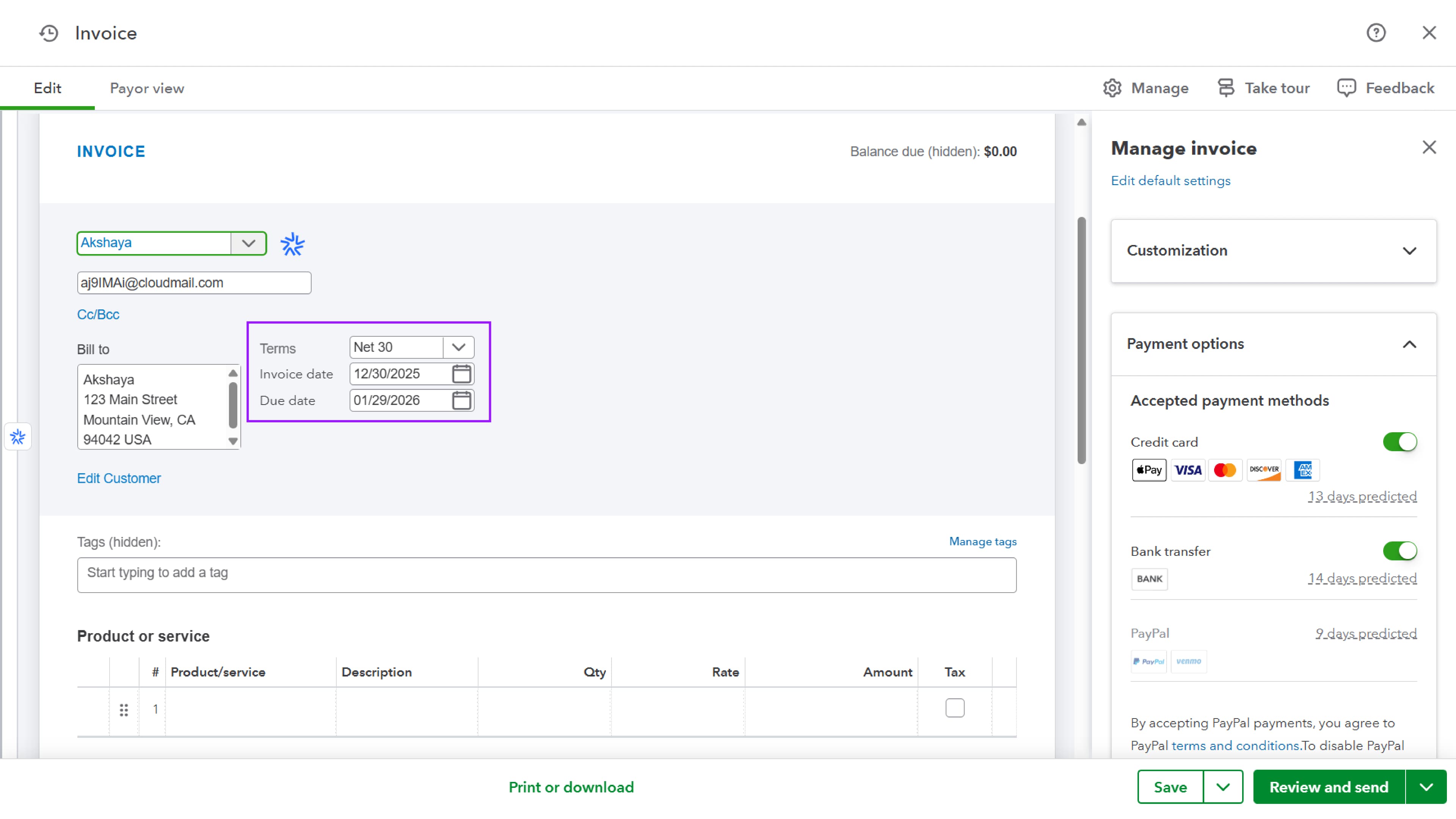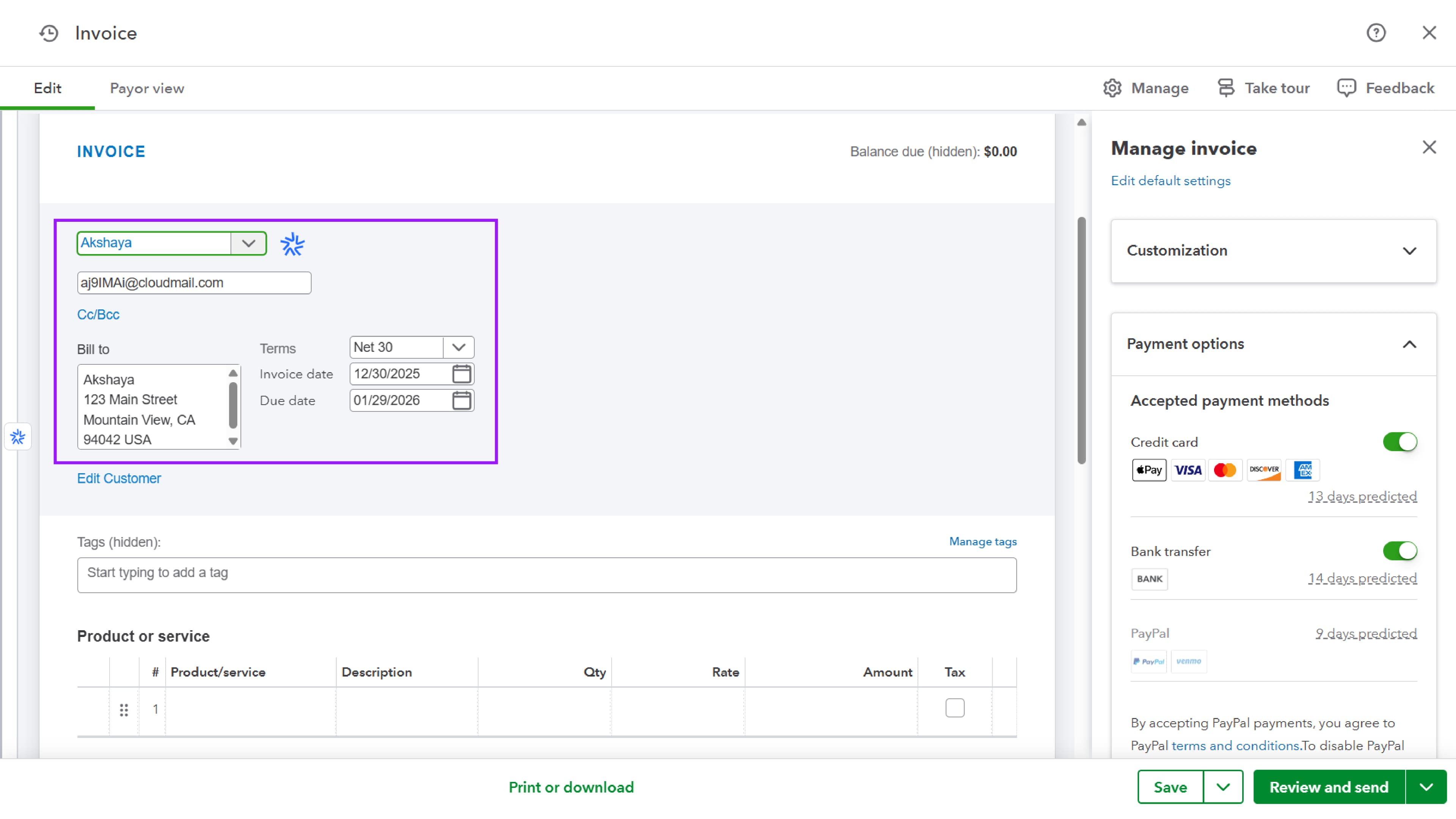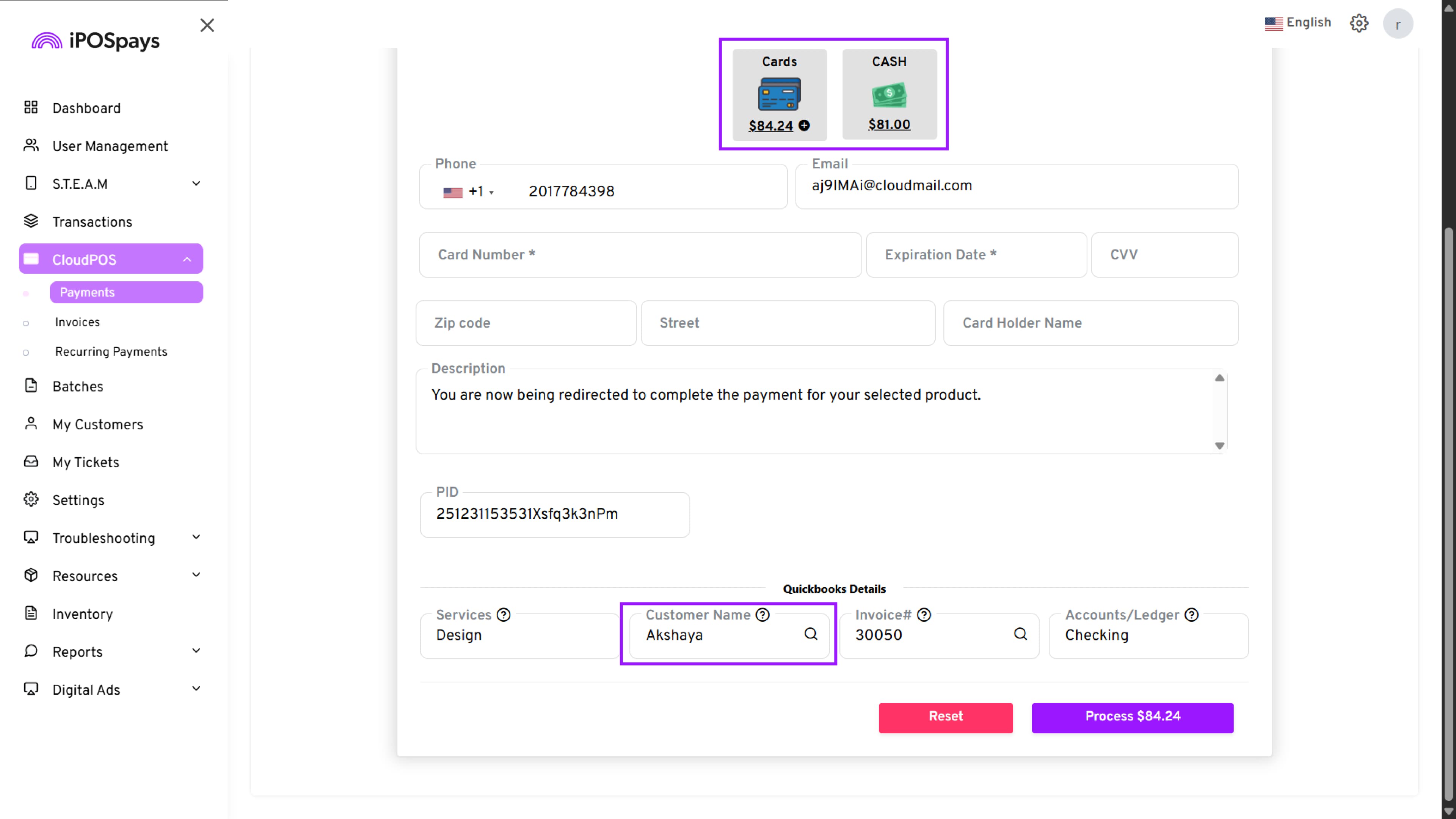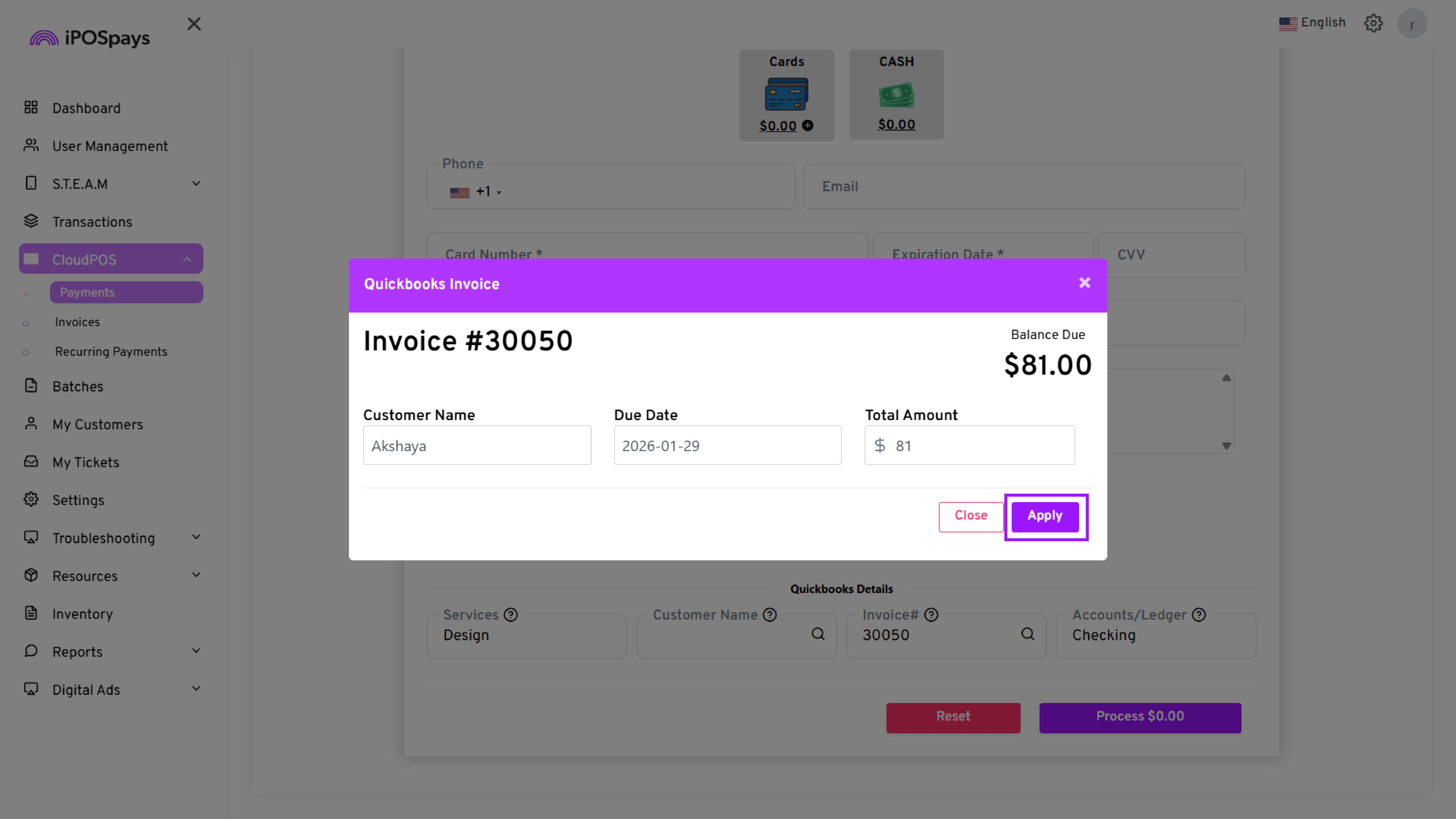 • The Transaction amount and Customer Name are automatically populated based on the invoice details in QuickBooks.