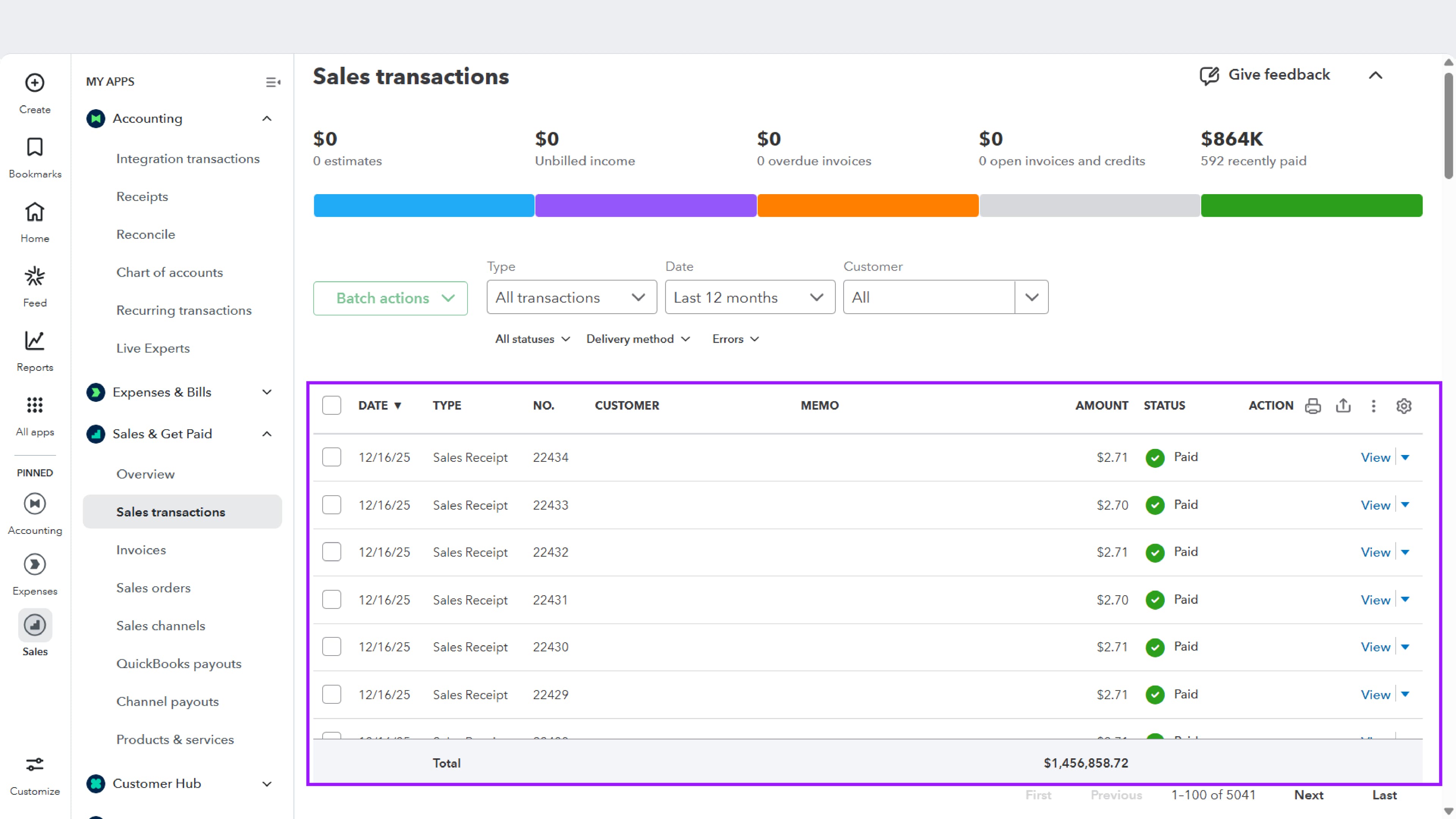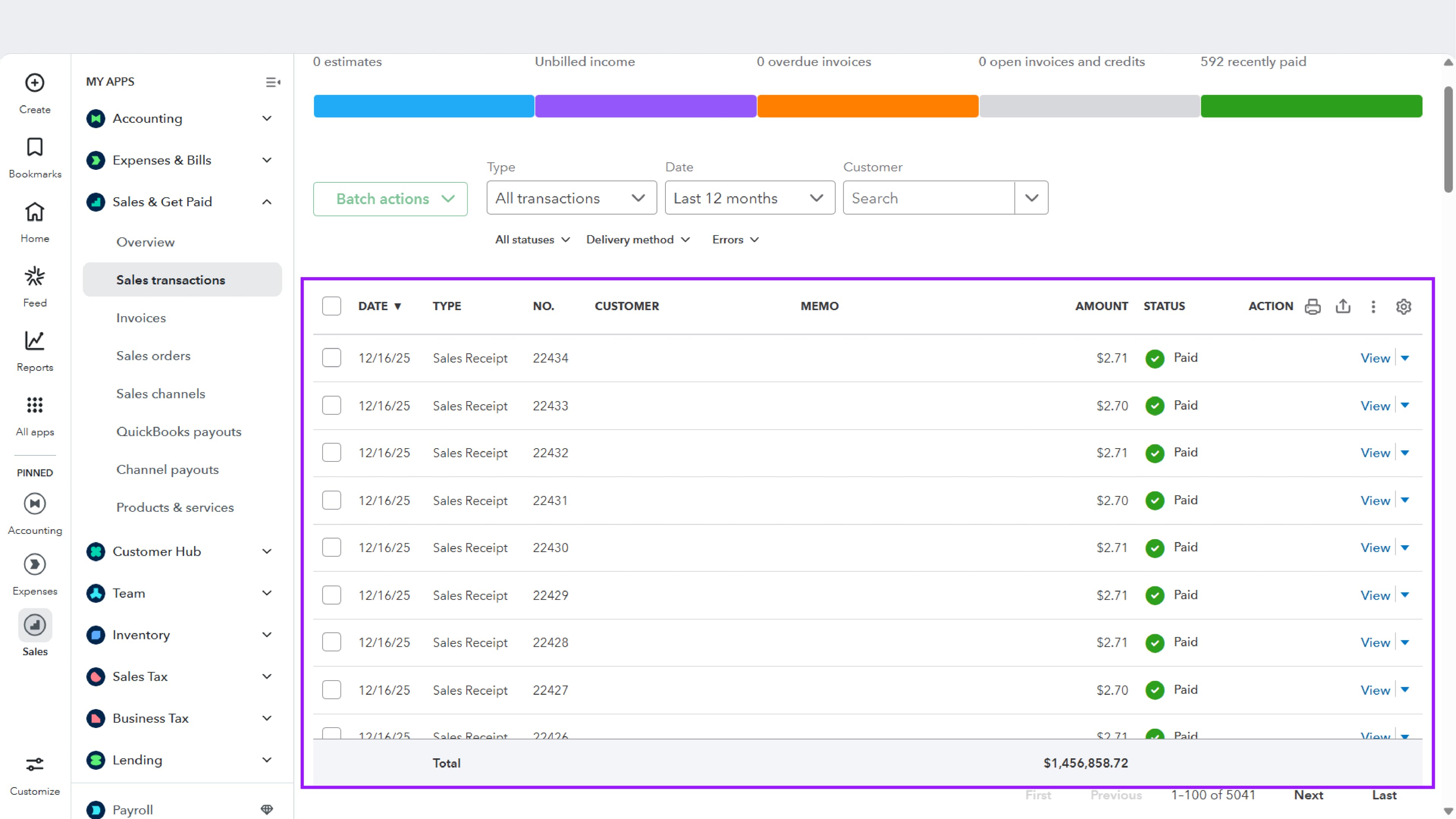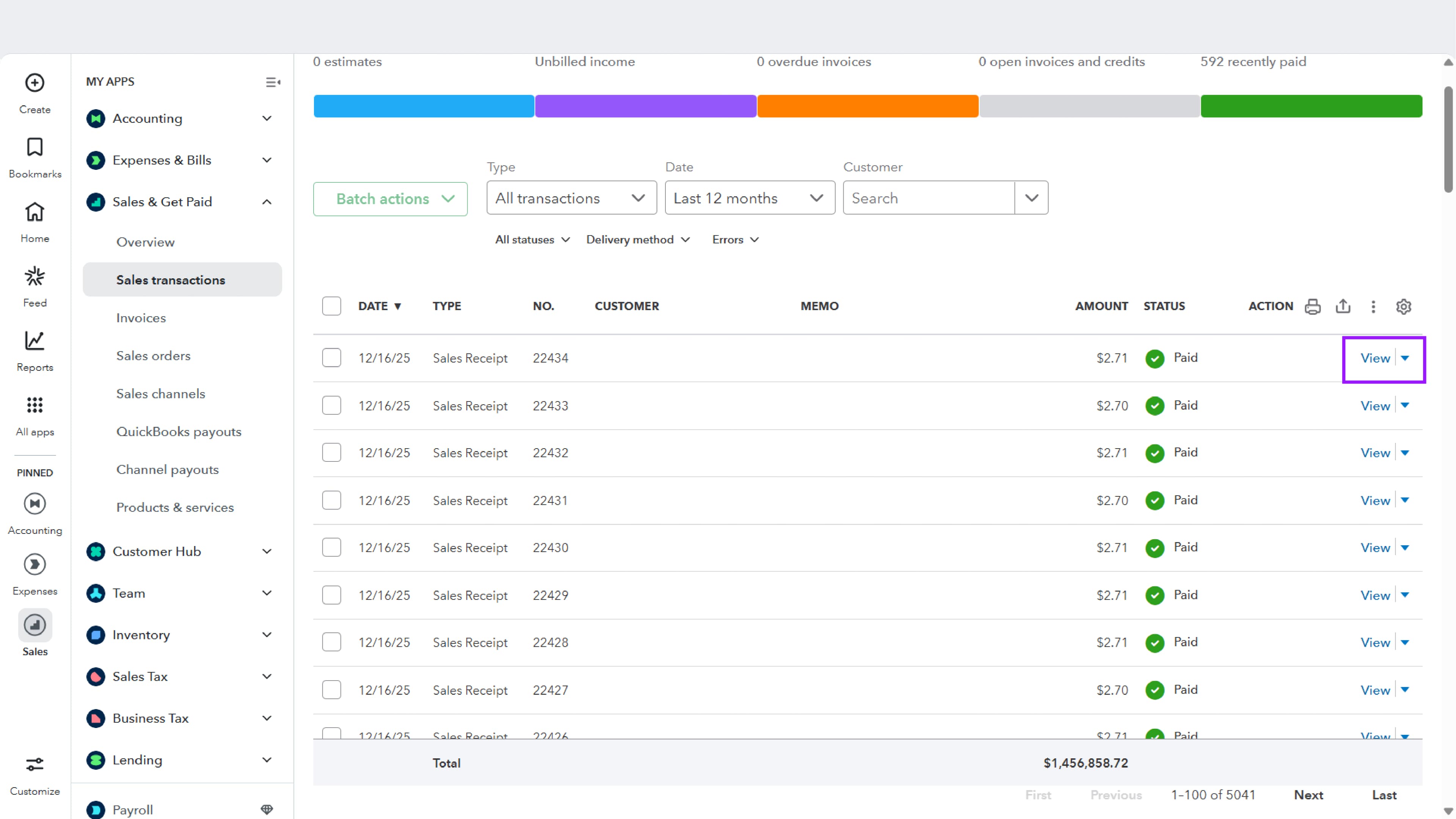 From the left-hand menu, click All apps, then go to: Sales & Get Paid → Sales transactions
